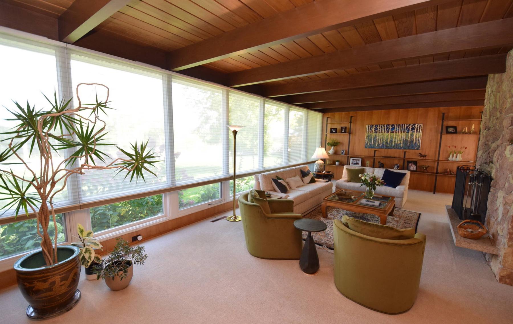 The main living area is surrounded by windows, allowing natural light to flood in from every direction. And while the original purpose of the windows was to capture sunlight, they also offer views of all the mature trees surrounding the house.