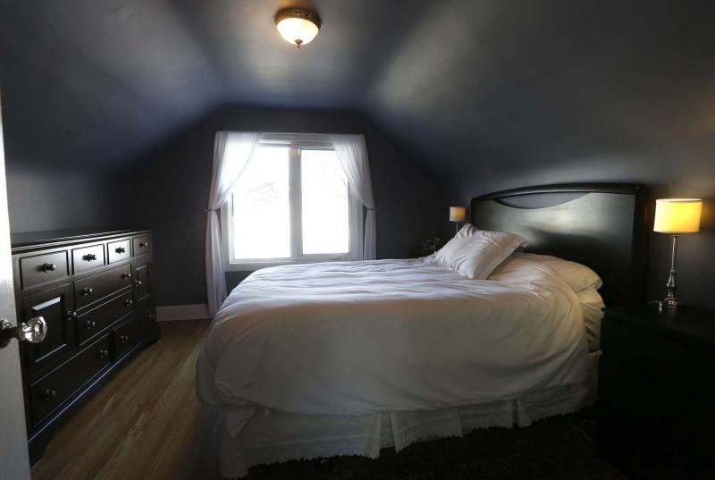 Light floods into the two bedrooms (including the master, shown here) not only from two newer, oversized, PVC windows, but from a large transom window on the same level.
