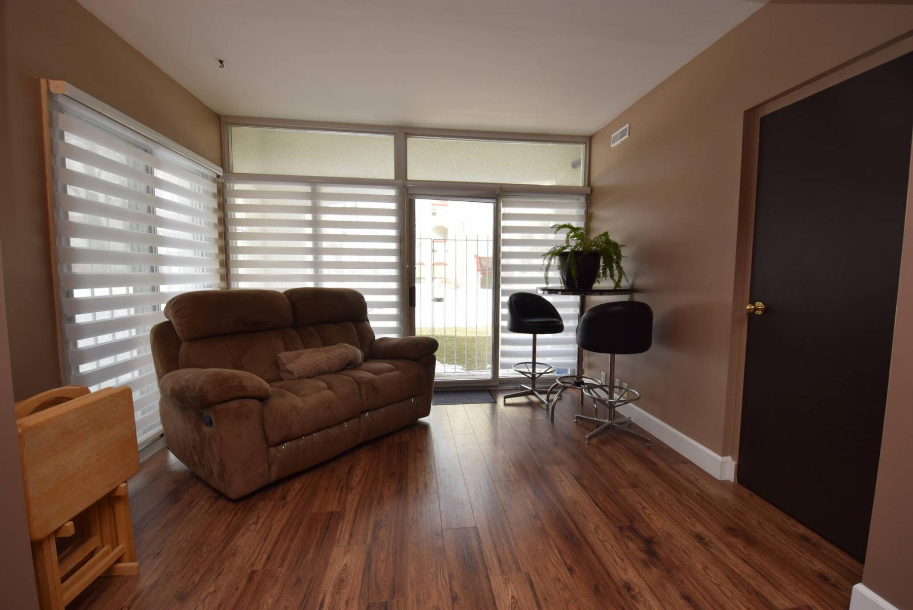 When the outgoing owner did the renovations in 2015, he had the patio converted into a four-season sunroom. Its surrounded by windows that let in tons of natural light and a patio door that takes you out to a covered patio that looks out onto the courtyard, not other suites.