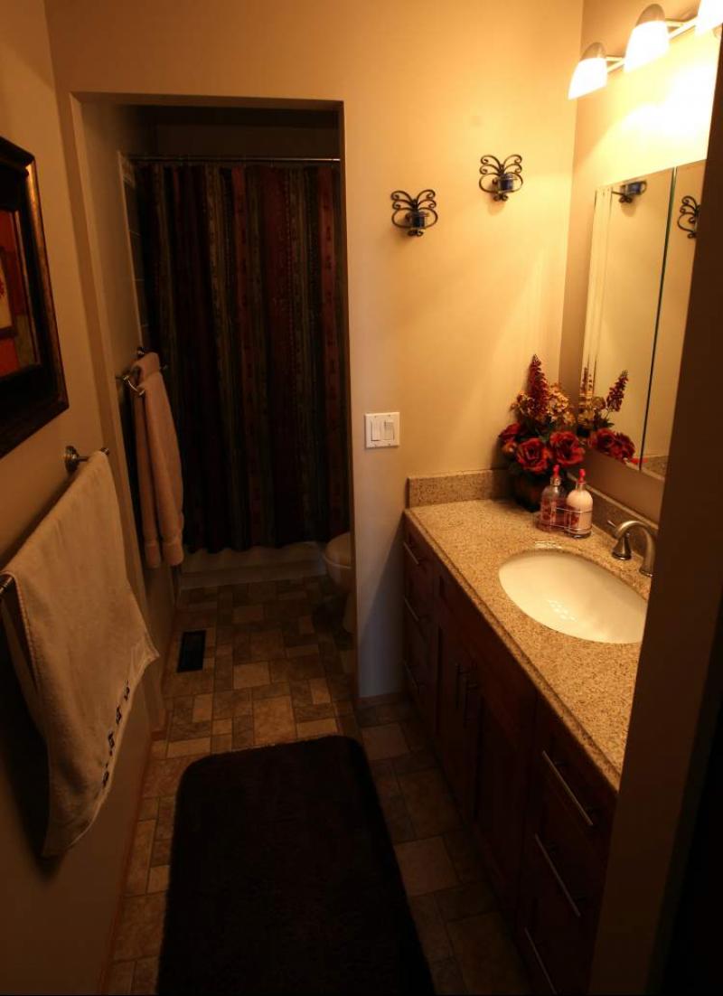 "It has a deep jetted tub (surrounded by newer taupe ceramic tile) that must just be a joy to soak in at the end of a long day," said Brown-Kornik. "The floor is a smart taupe/beige faux tile (vinyl), and the vanity is the same (cinnamon) maple that was used in the kitchen, along with a tan granite countertop. There's also a double linen closet next to the vanity for handy storage."