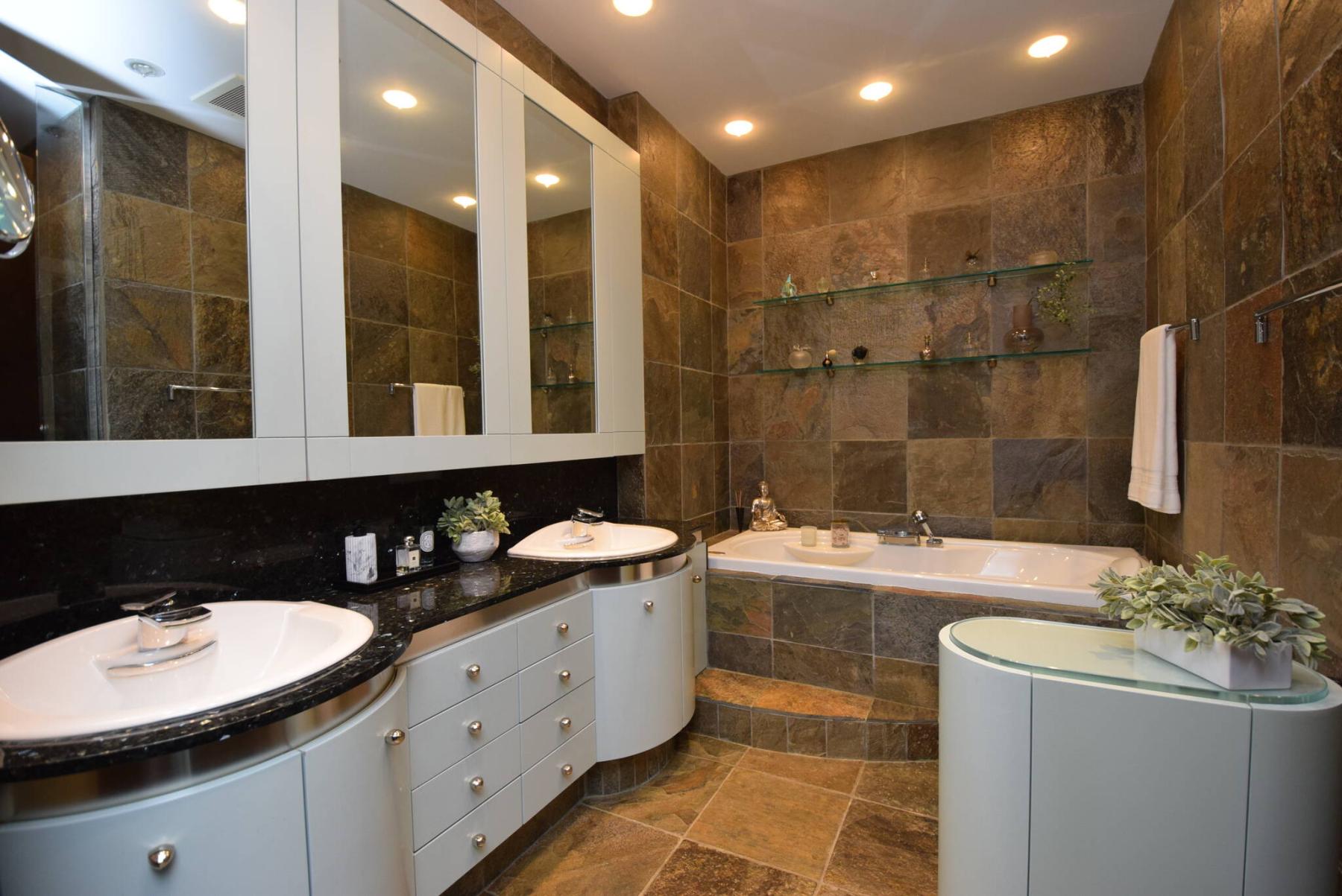 “Again, you get that wonderful view of the river and city, plus a 10.6-foot-high ceiling that gives is a great feeling of volume. The walk-in closet is huge and comes with built-in storage that features impeccable millwork, while the ensuite is a practical work of art with its jetted soaker tub, tiled walls and floor and curved dual sinks.”