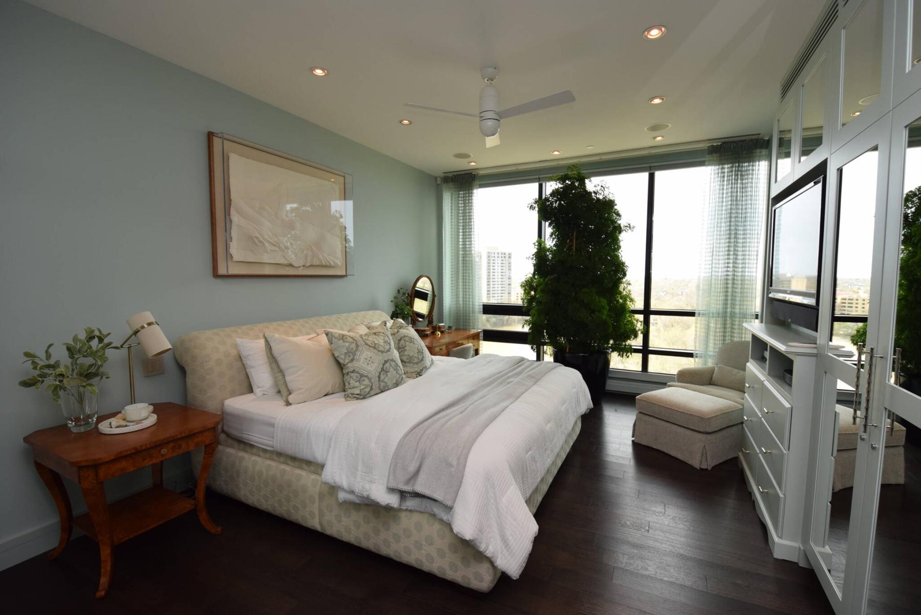 Relaxation comes naturally in the primary bedroom thanks to breathtaking river and city views and a warm, inviting that instantly lowers your blood pressure.