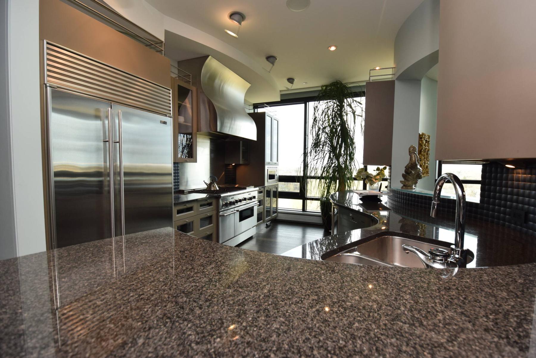 “The kitchen is not only gorgeous, but practical,” De Leeuw says. “A curved granite countertop gives it a wonderfully unique style, while the cabinetry, 48-inch Thermador gas range and Sub- Zero fridge/freezer are remarkable. It’s a genuine chef’s dream, both in its style and function.”