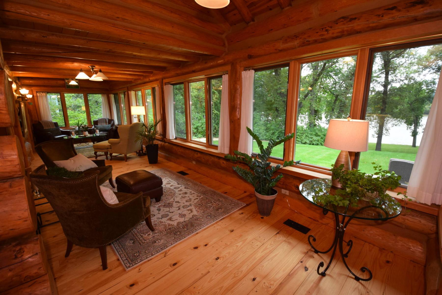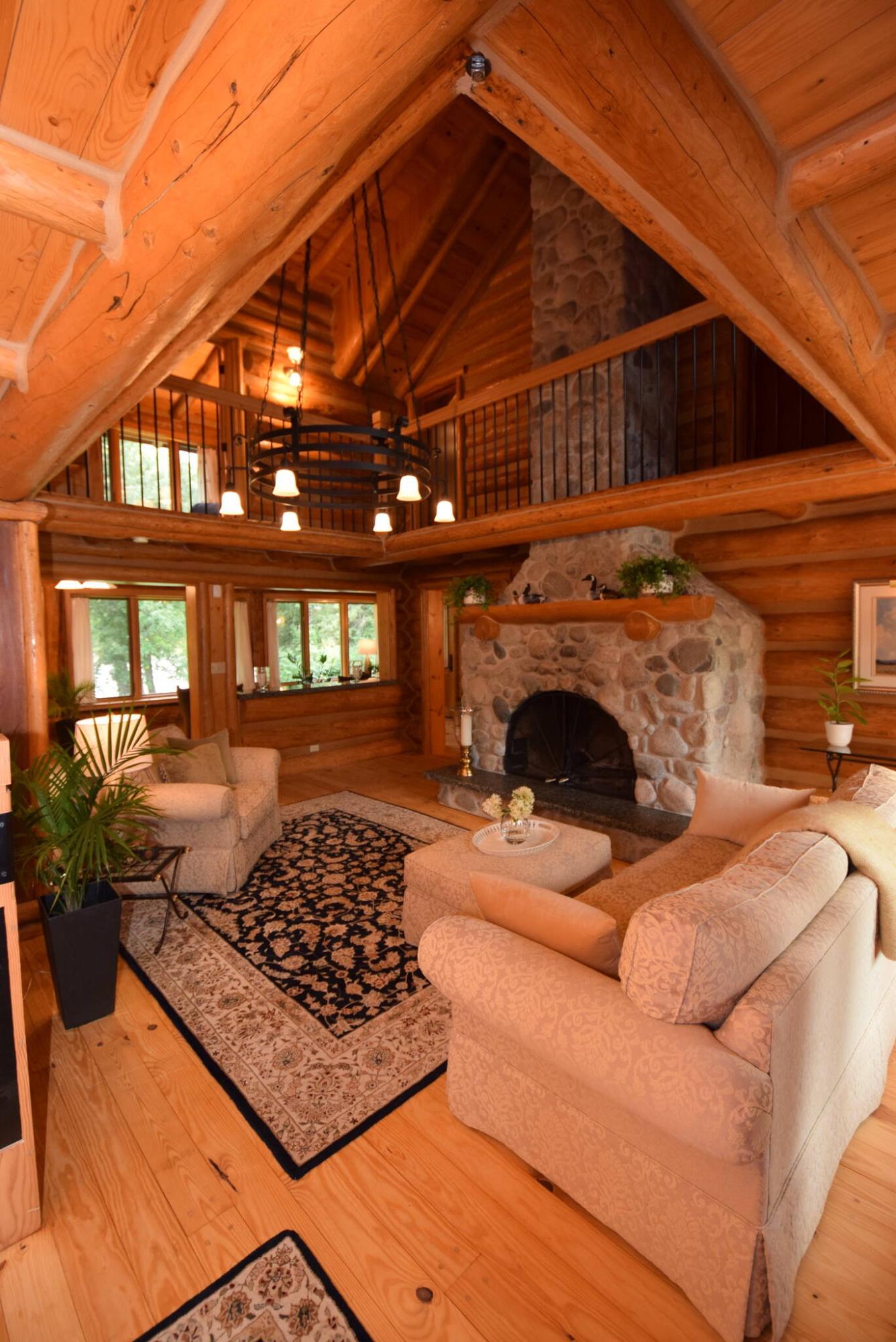 “You can’t see it from the road,” he says. “A long, winding driveway surrounded by towering trees and lush foliage provides access. When you get to the end, and it opens up to reveal an incredible tamarack log home that sits on a spectacular, and very private, riverside estate.”
