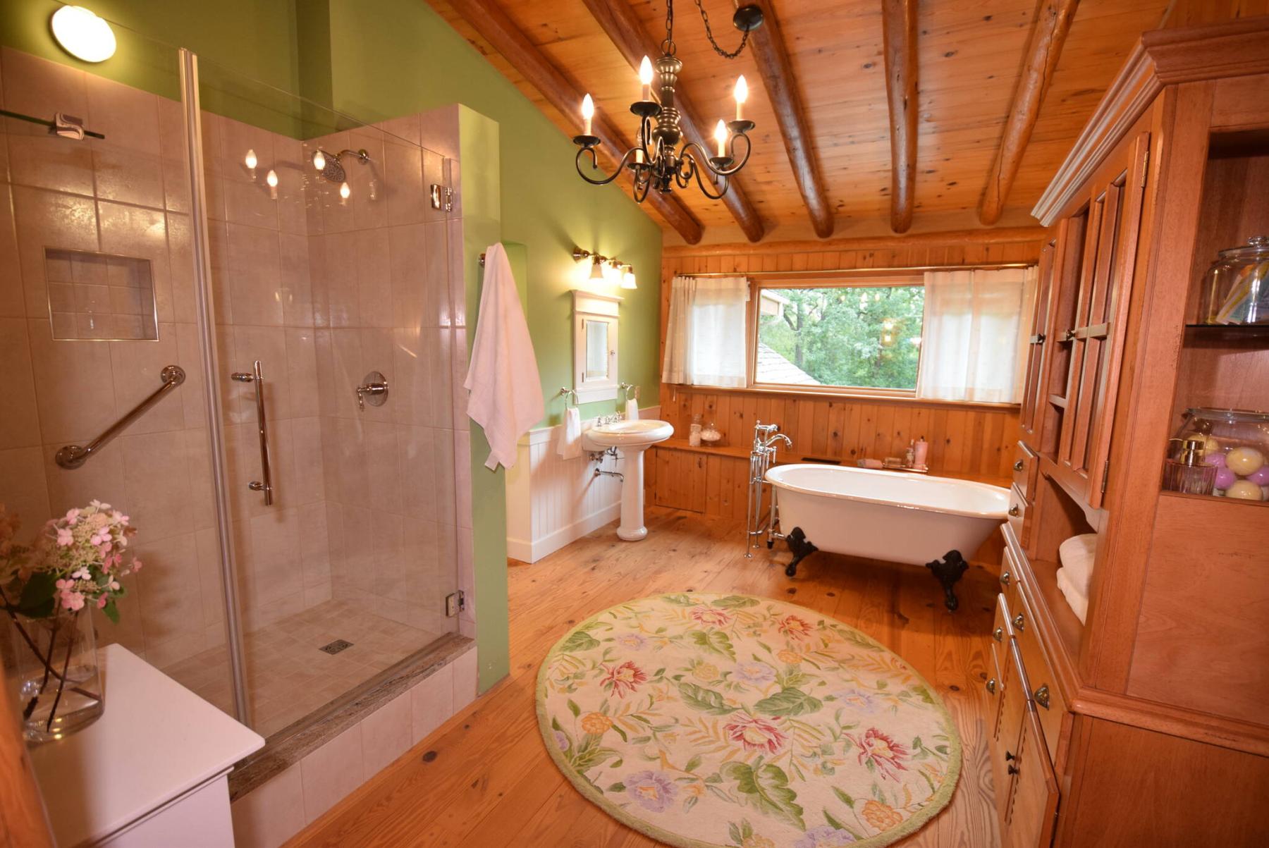 “If you want to shed stress after a challenging day, it’s the place to do it. It offers a vaulted beamed ceiling, clawfoot soaker tub beneath a big window and a gorgeous, tiled walk-in shower. Being surrounded by all the space, light and warm finishes fills you with a feeling of peace.”