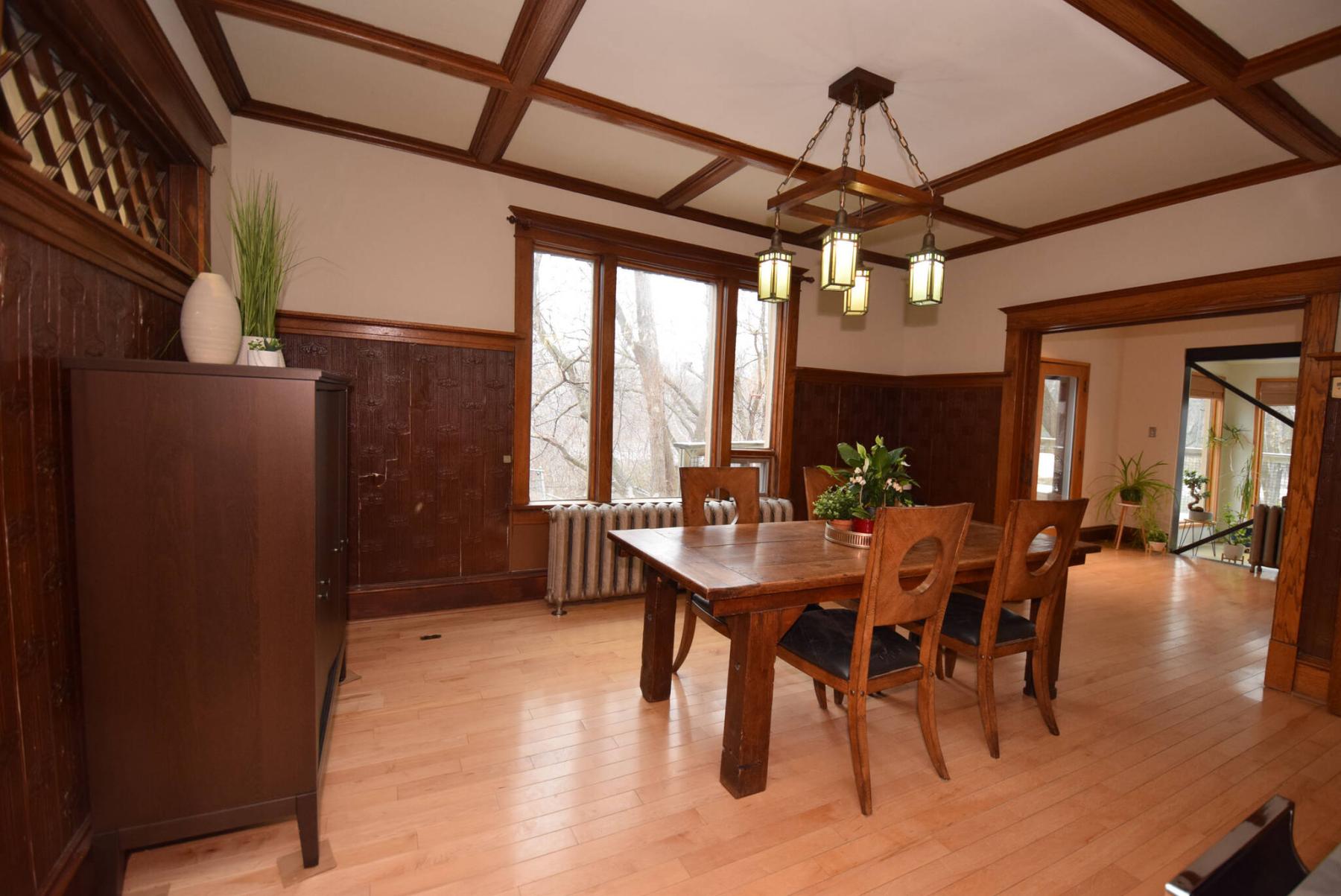 With its beamed ceiling, wainscotting and oak-trimmed windows and doors, the elegant formal dining room speaks to the home’s early-20th century origins.