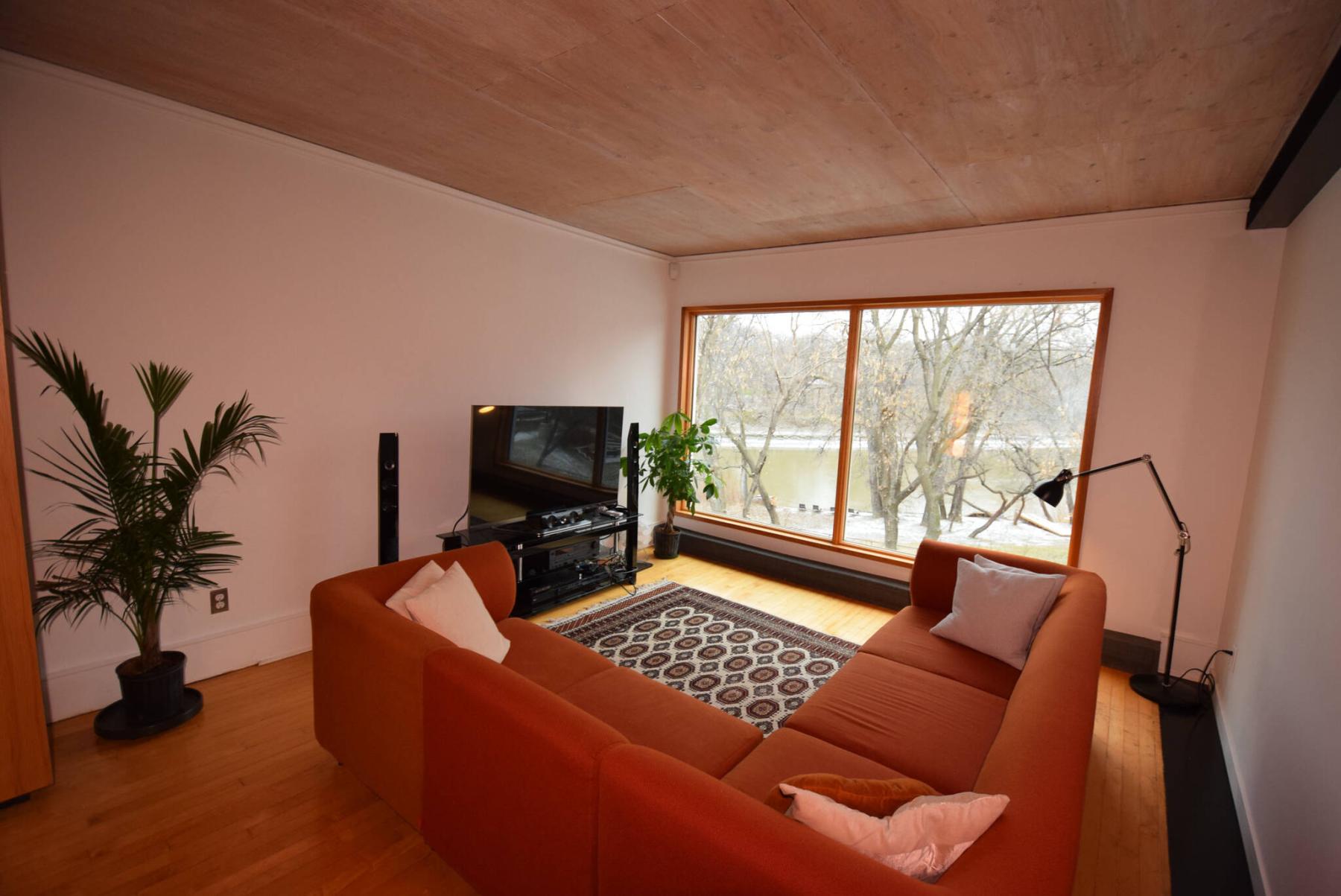 The media area, which is part of a second-floor loft that also offers a flex area, has a large window on its rear wall looking out onto trees in summer and the Assiniboine River the winter.