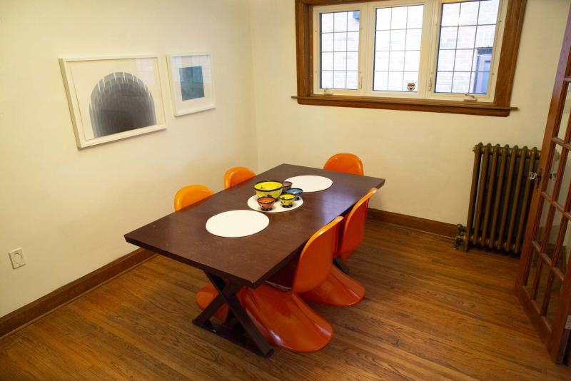 "A five-foot doorway featuring original oak French doors leads into a huge space that’s over 13 feet long and 10 feet wide. It can easily accommodate a table for six to 10 and classic features like the oak-trimmed window, original hardwoods and classic heating register give it tons of character."