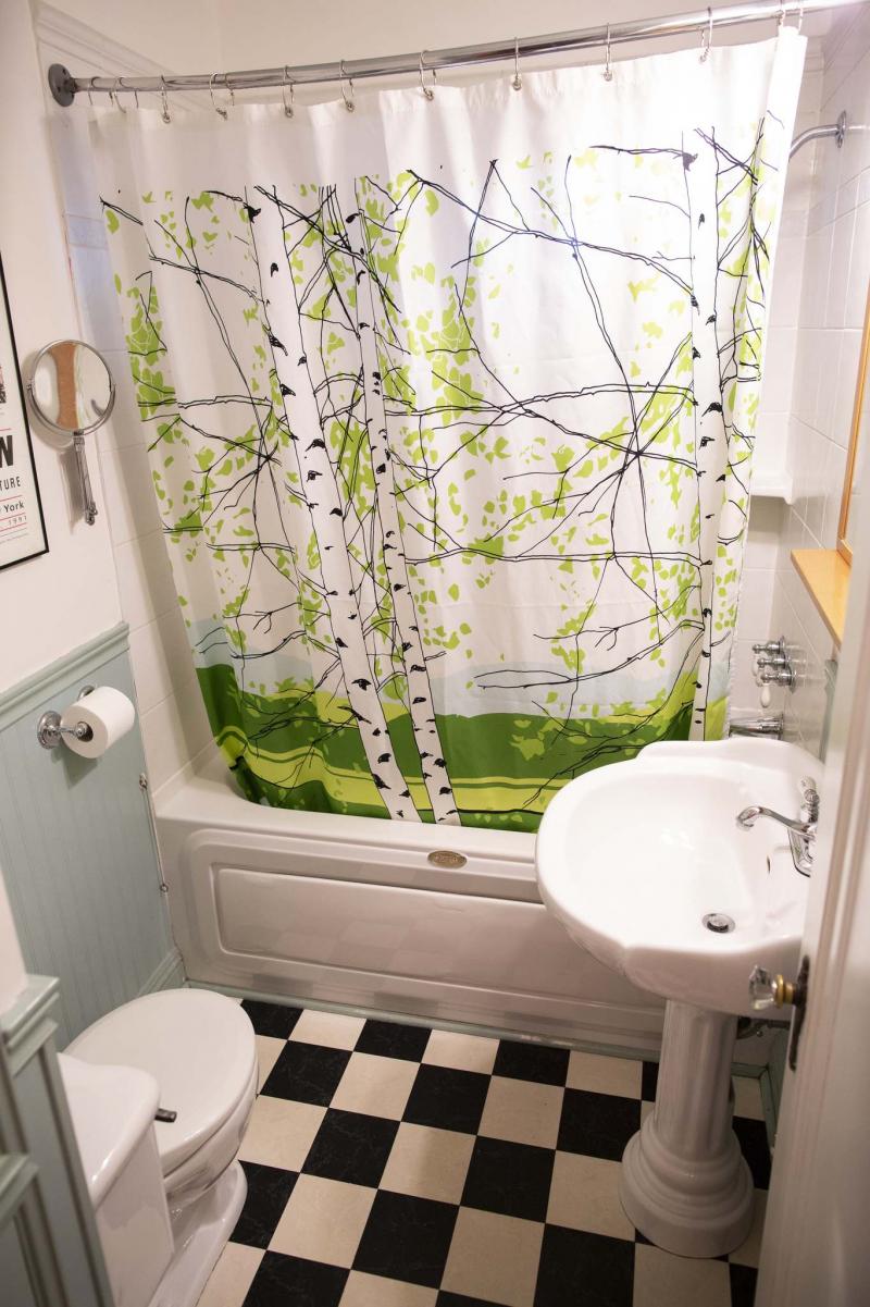 A four-piece bathroom features checkered flooring and corresponding white fixtures.