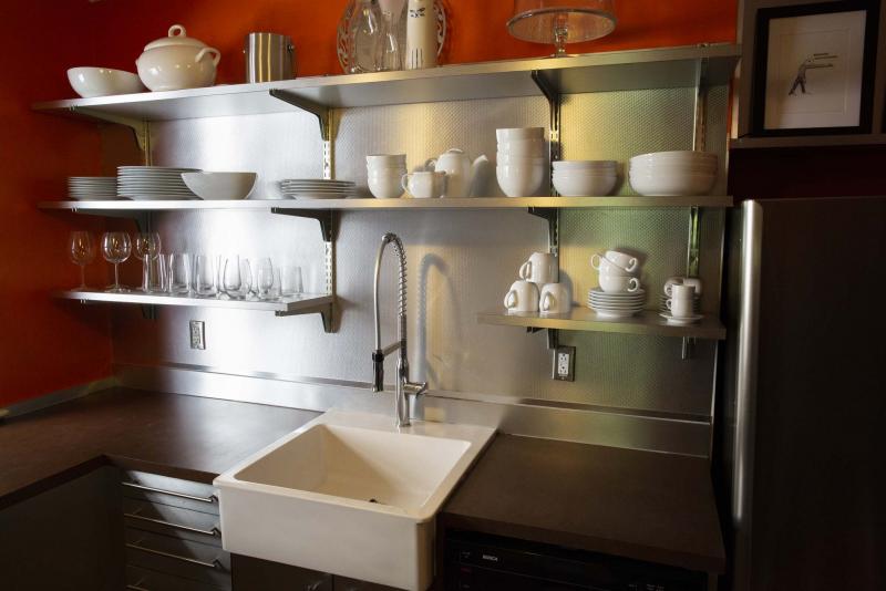 "It’s a fabulous space that features open shelving, a farmhouse-style sink, fantastic lighting and tons of stainless-steel style drawers. Plenty of light flows in from a huge window on its back wall and tile and stainless backsplashes — plus a stainless hood fan over the stove — add style. Most importantly, there’s plenty of room to move around and create."