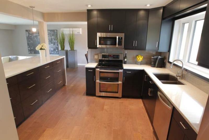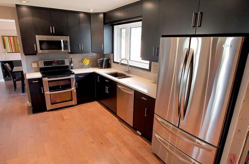 The kitchen features a combination of charcoal and cappuccino maple cabinetry, the former around the periphery of the kitchen, including the cabinetry placed either side of a double sink with a huge window above it on the rear wall, and the latter providing stylish cover for all kinds of storage space.