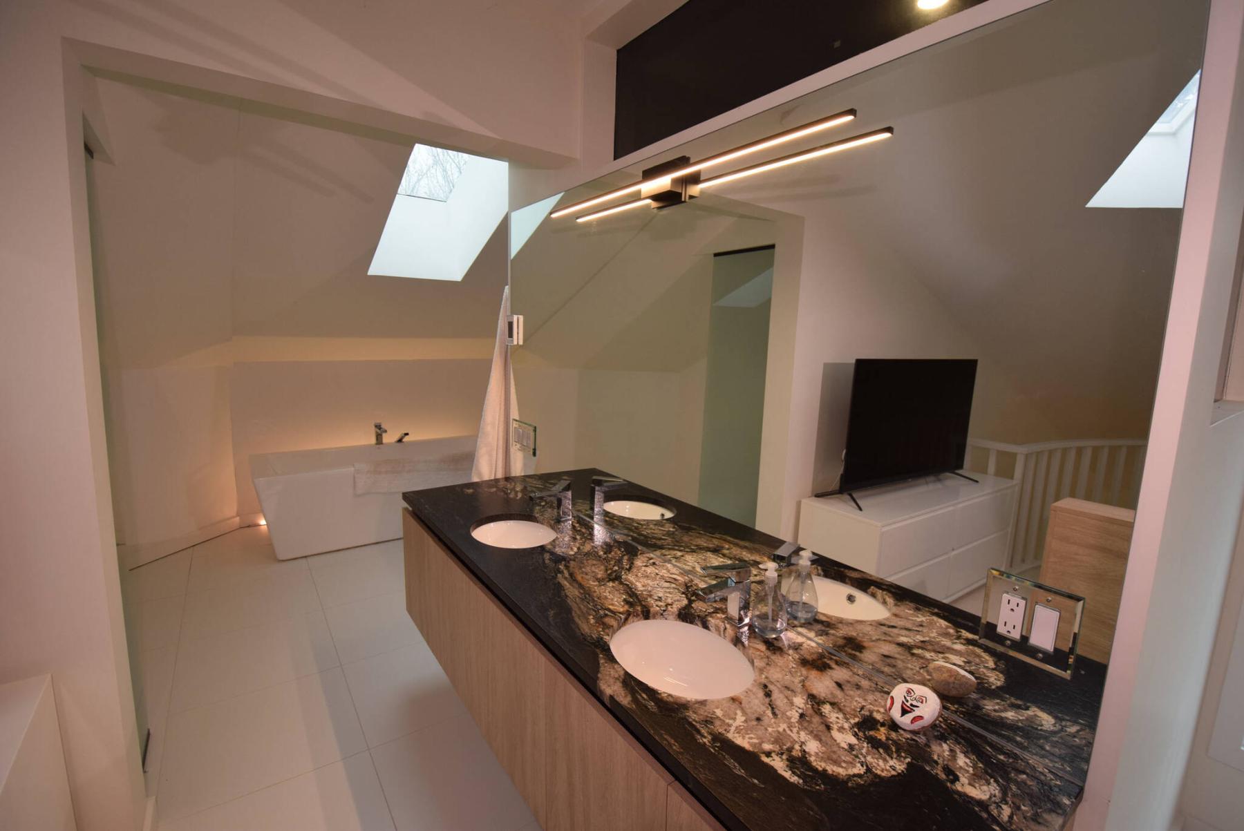 “It starts off with an incredible wall-hung vanity with dual sinks and an amazing matte-black granite countertop with multi-coloured, earth-tone swirls that surround the sinks. The space to its rear offers a vaulted ceiling, freestanding tub with backlighting, a tiled walk-in shower with rain shower head and another skylight that lets in more natural light.”