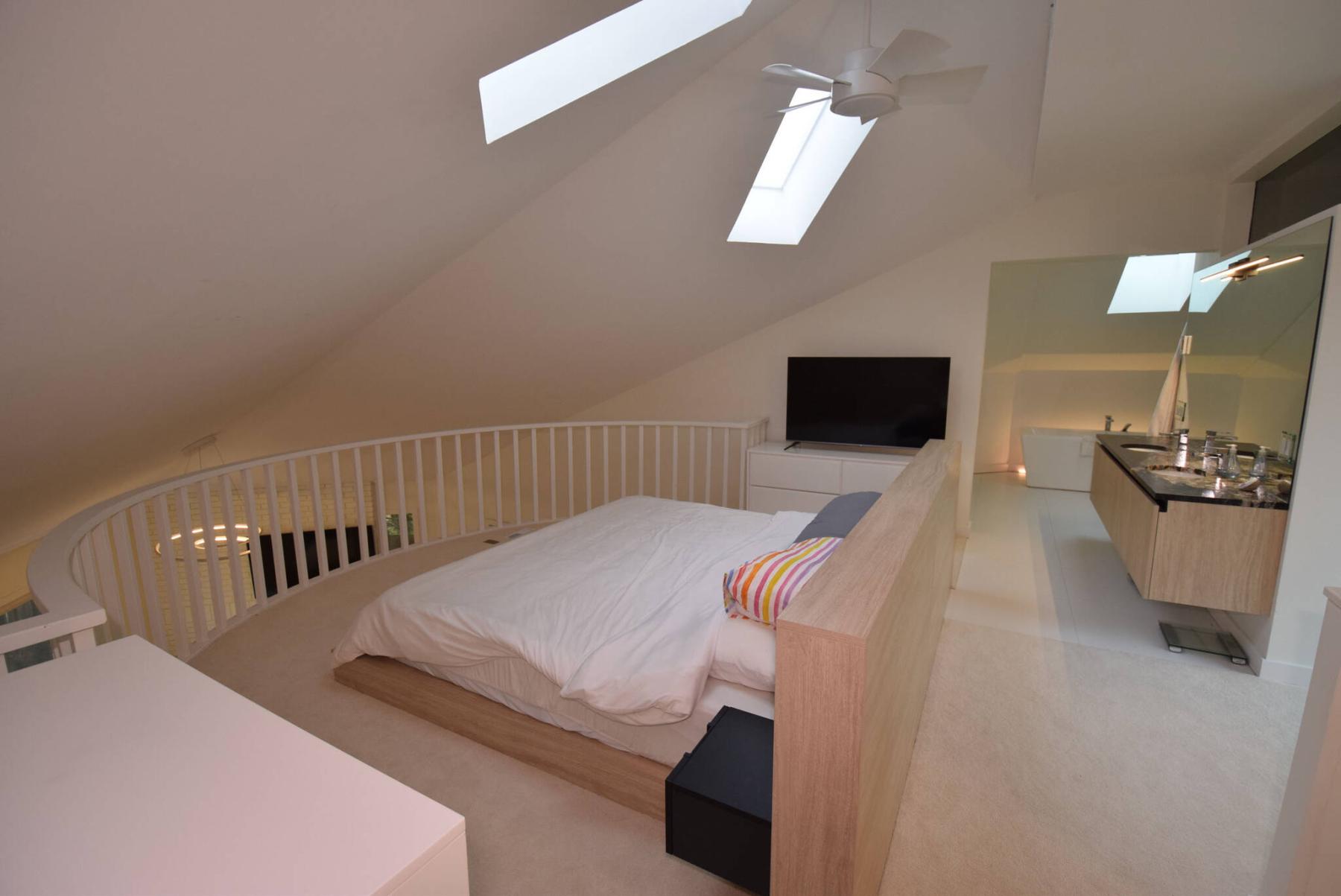 “Like all the other rooms in the home, this offers a different feel. In this case, you’re up in a bright, airy loft that comes with a vaulted ceiling, a bedroom area with two skylights over it and a separate walk-in closet that holds tons of wardrobe.”