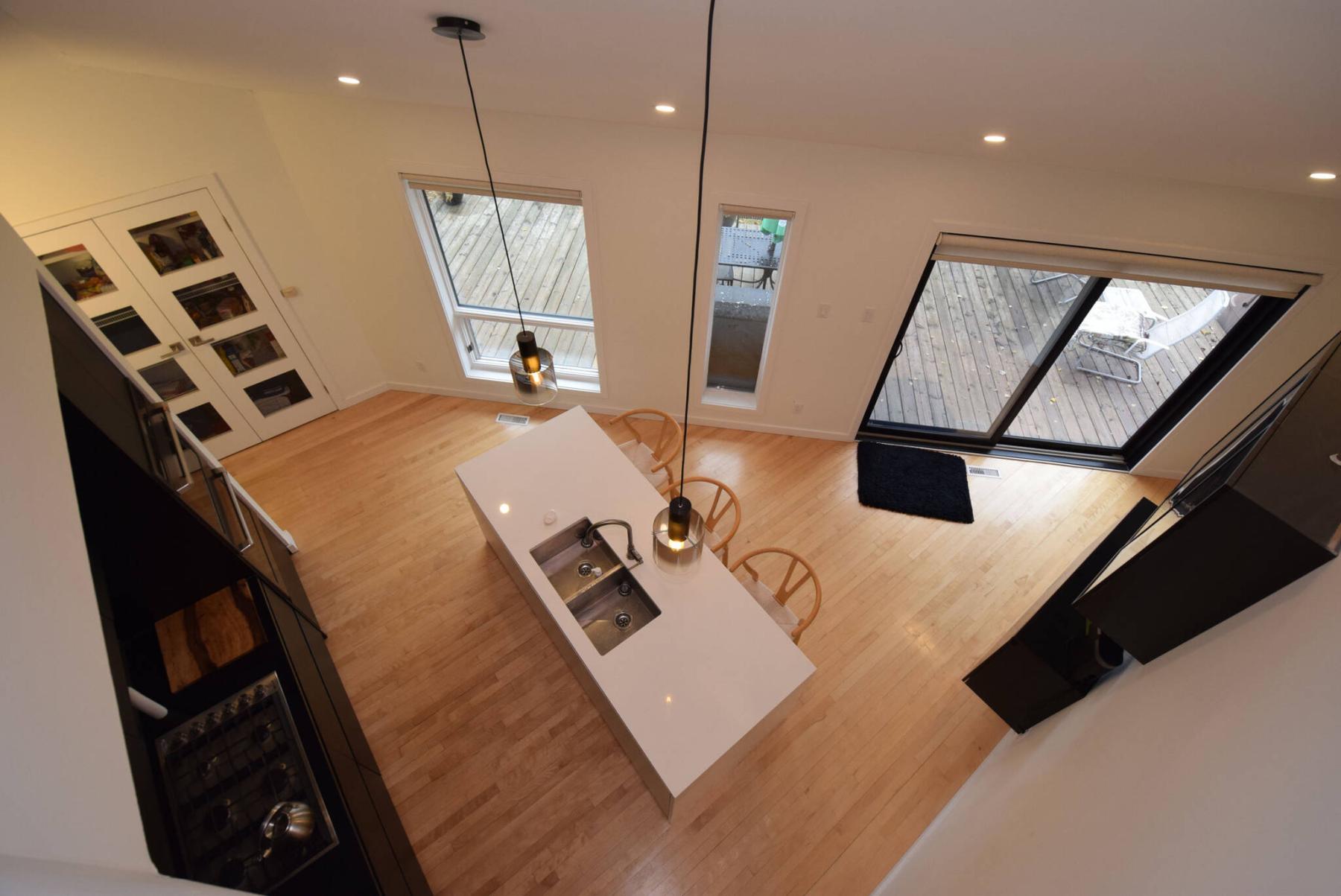 The view from above the one-and-a-half-storey Wildwood home’s tastefully remodelled island kitchen is amazing.