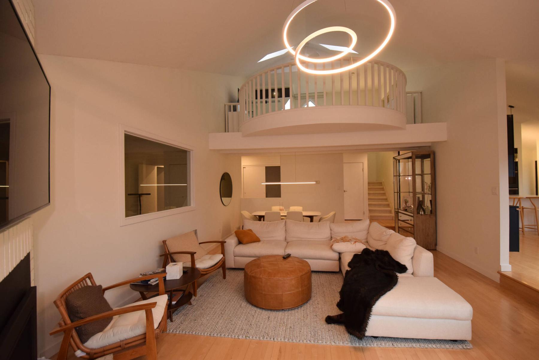 “Tons of light comes in through a big window on the rear wall, while a gas fireplace adds a nice, cosy touch. The feature that really makes the space is the vaulted ceiling, which allowed for a gorgeous balcony, which frames the loft-style primary bedroom above. It’s an amazing design feature that really sets this home apart from others.”
