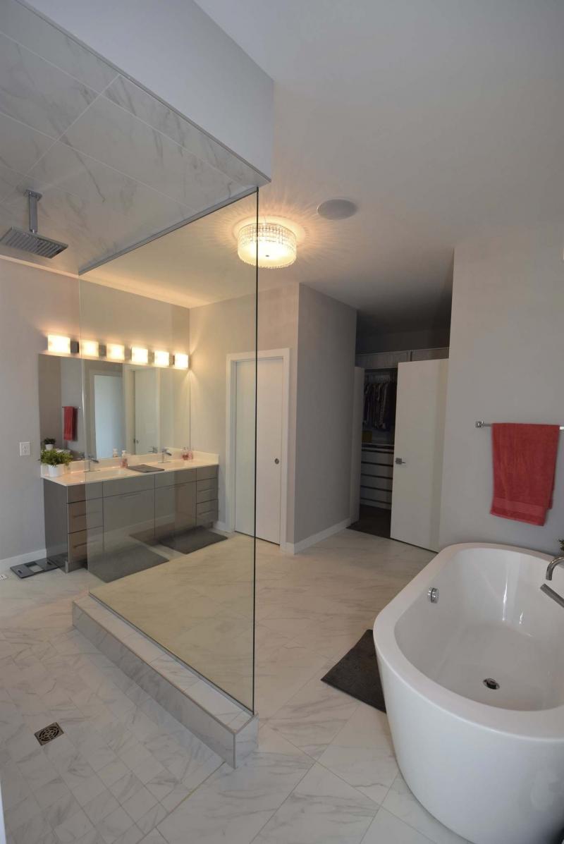 "It features a cool layout," he says. "Its entrance leads into a Euro-style ensuite with standalone soaker tub, semi-enclosed custom glass/tile shower with rain shower head, and amazing walk-in closet. Doorways on either side of the shower lead into the master suite, which features gorgeous wetland views and a patio door that provides access to the deck overlooking the lake."