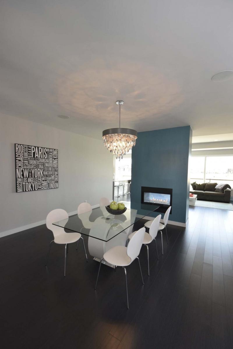 "Its huge picture window provides a spectacular wetland view and the gas fireplace with its teal paint pops with the dark hardwoods and the grey paint tones on the walls surrounding it. The TV niche is simple, yet effective — it doesn’t divert attention from the view, or the fireplace."
