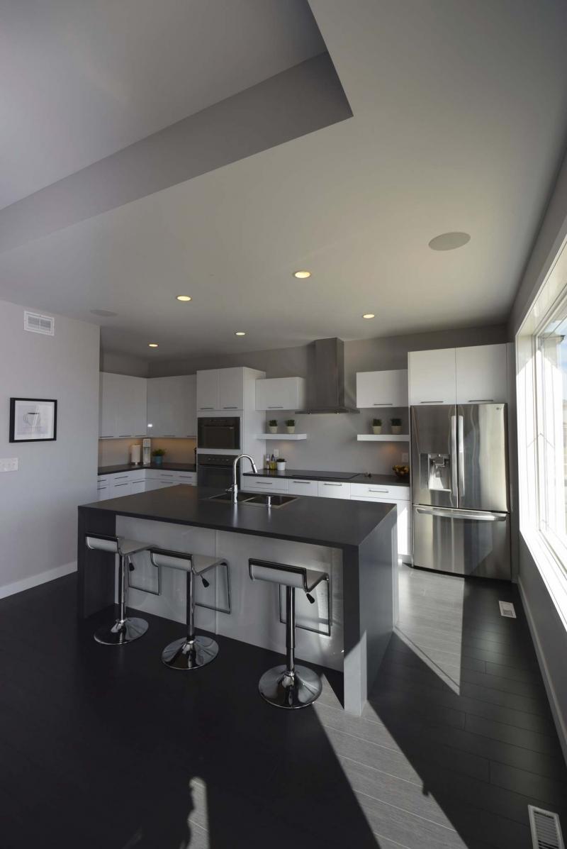 "There’s a ton of glossy thermofoil cabinets that contrast beautifully with gorgeous, (mocha) laminate countertops that feature an amazing textured surface. Espresso engineered hardwoods — the outgoing owners put them in because they mimic a slate/granite look — lend an extra bit of richness to the area."