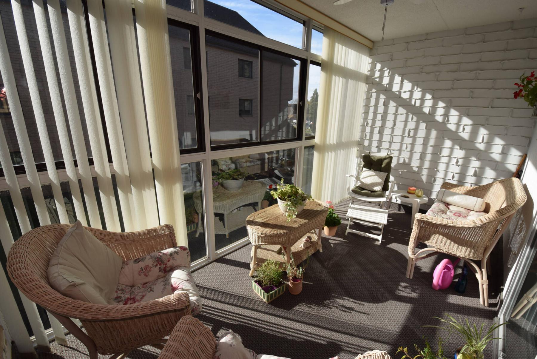 Accessed via a sliding patio door on the living room’s rear wall, the enclosed balcony is a lovely space ideal for entertaining or kicking back with a good book.
