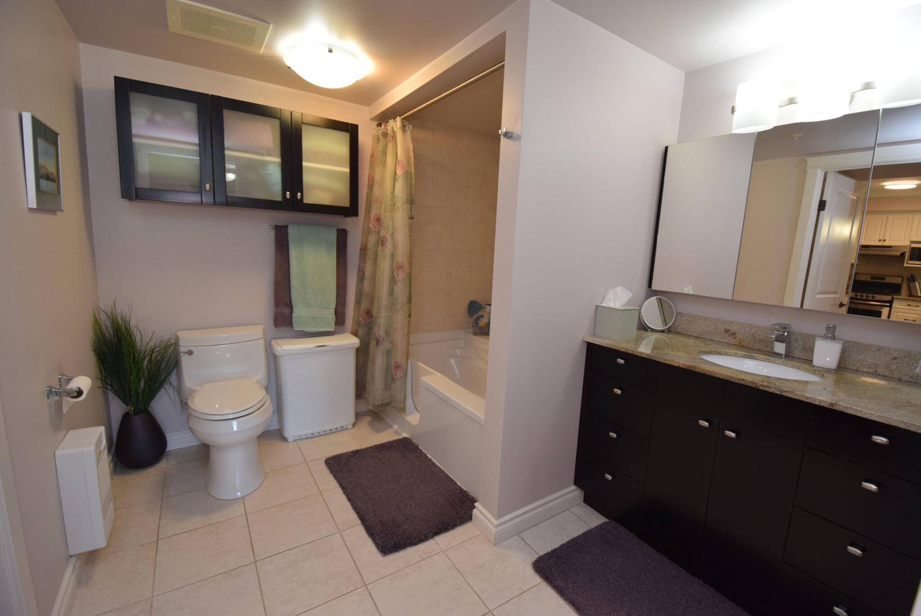 The spacious main bathroom features a tile floor, walk-in bath with heated seat and vanity with ample storage space.