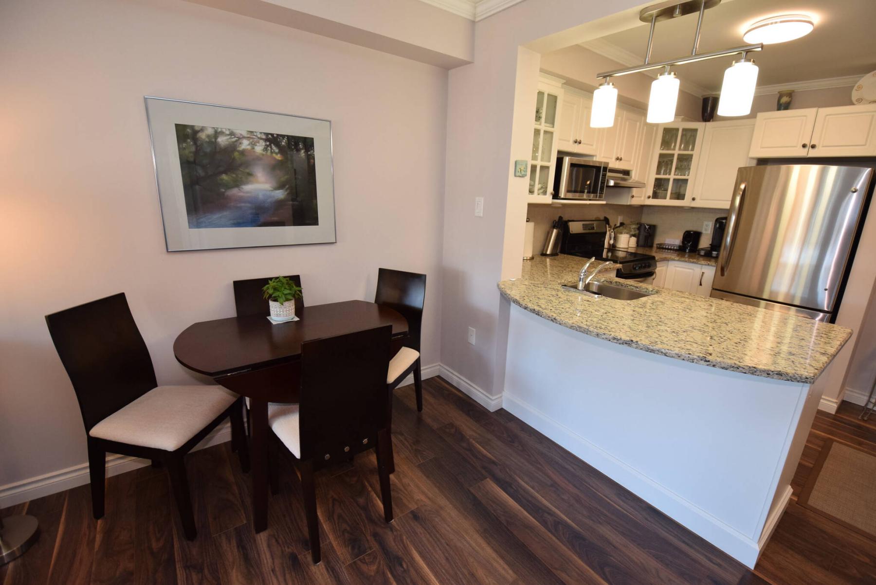 Tucked away to the right of the foyer, the peninsula kitchen is just the right size, offering a mid-sized counter space with prep area and breakfast bar that can seat two.