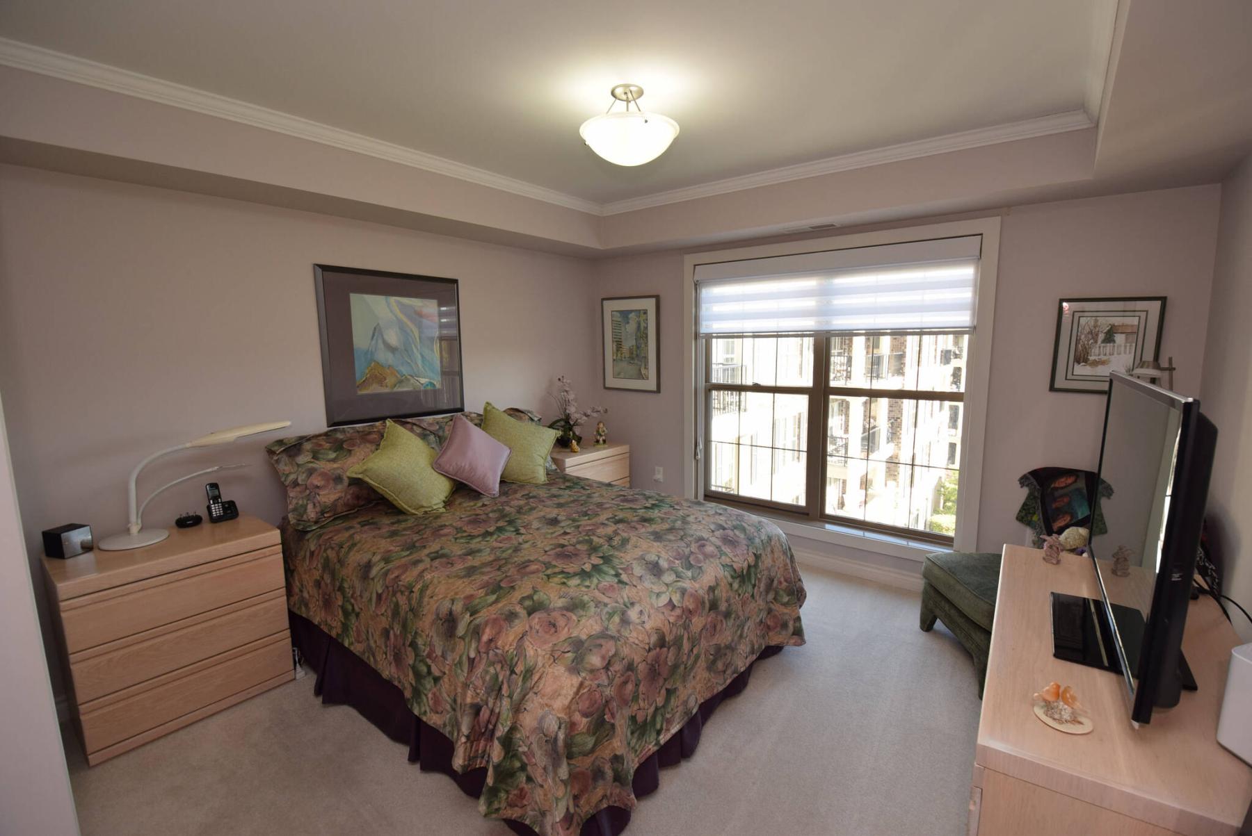 “Again, you get that wonderful courtyard/river view through a huge window on its rear wall,” she says, adding that a tray ceiling above adds a touch of class. “The bathroom is a good size with a tile floor, walk-in tub with heated seat and vanity that offers lot of storage. The suite also comes with in-suite laundry. It has everything you need, just in the right spot.”