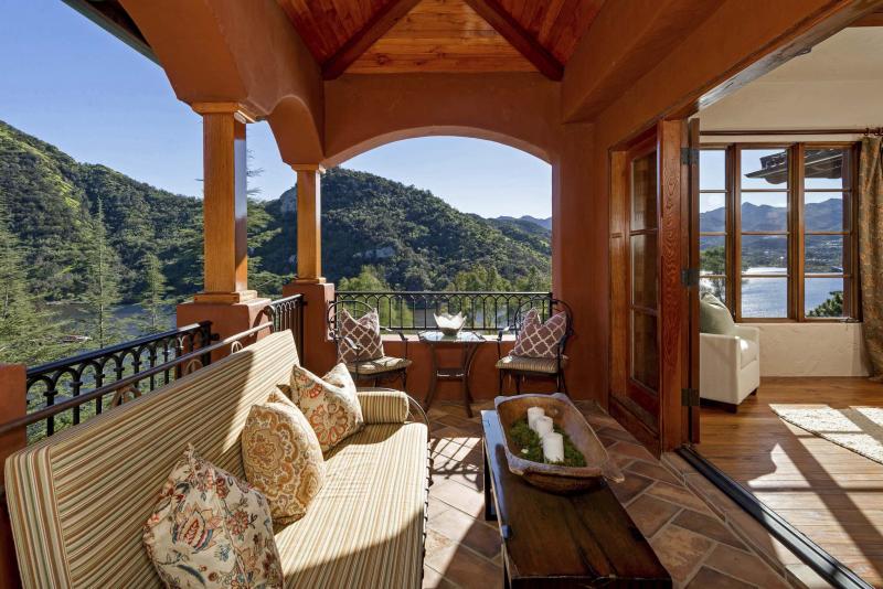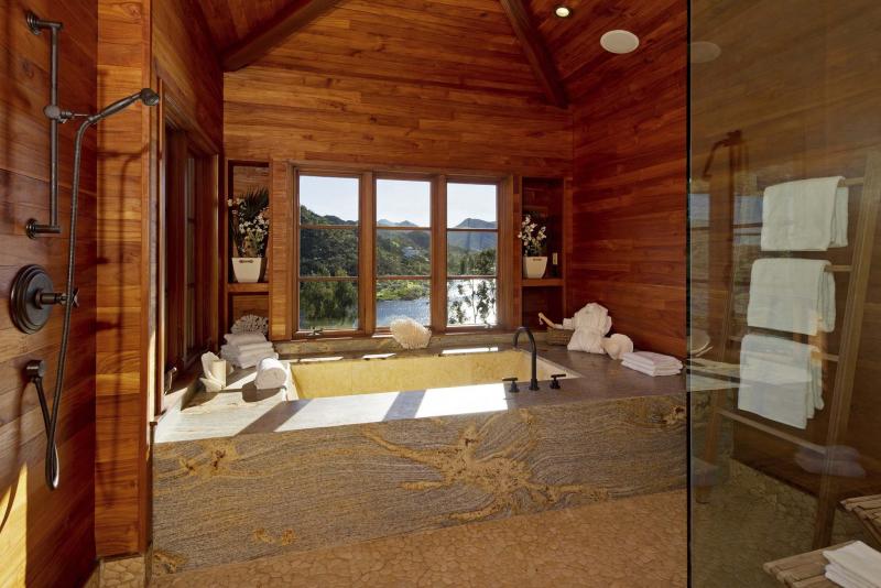 Set at the end of a steep road on a private cul-de-sac, the rustic home has three bedrooms and three bathrooms within its 5,300 square feet of living space. There are lake and mountain views from the master suite, living and dining rooms and balconies.