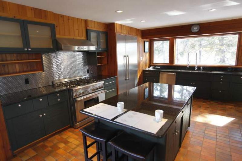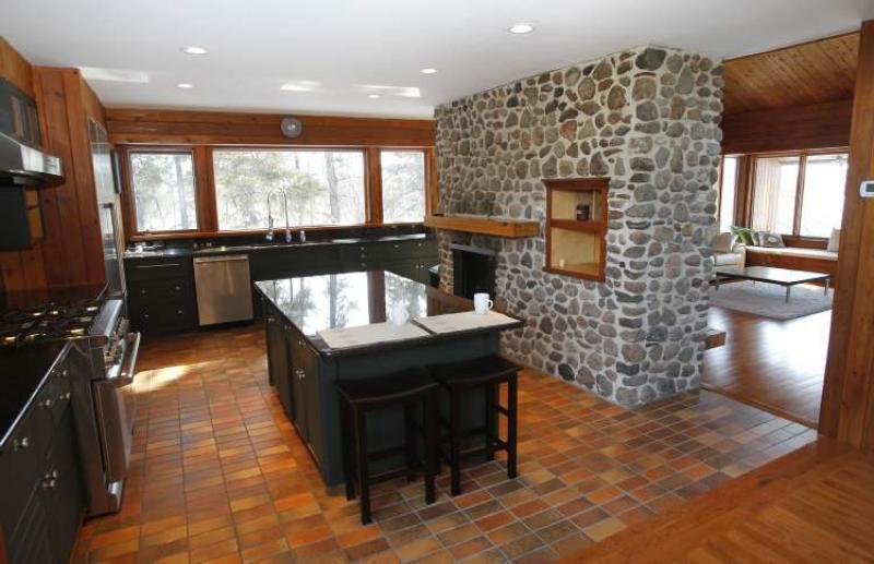 "It opens up nicely to the dining room and offers an eight-foot centre island (with eating nooks for two at either end), a tile floor, (black/copper) granite countertops, stainless backsplash (behind the Thermador range) and an industrial-style Sub-Zero fridge," he said. "The view from the kitchen through a 15-foot-wide window over the double sink is amazing, with the river and mature pines."
