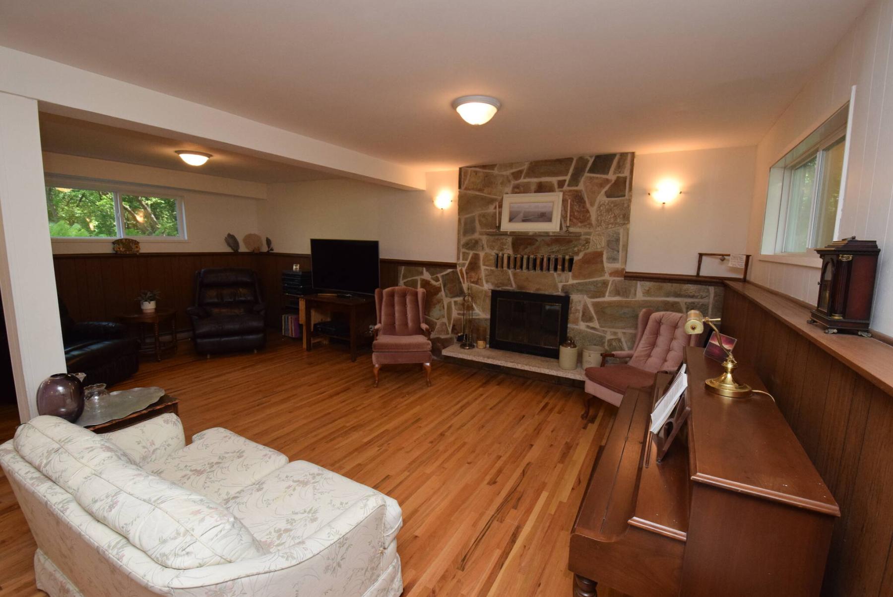 Surrounded by large windows, the spacious lower level rec room is centred around a wood burning fireplace.