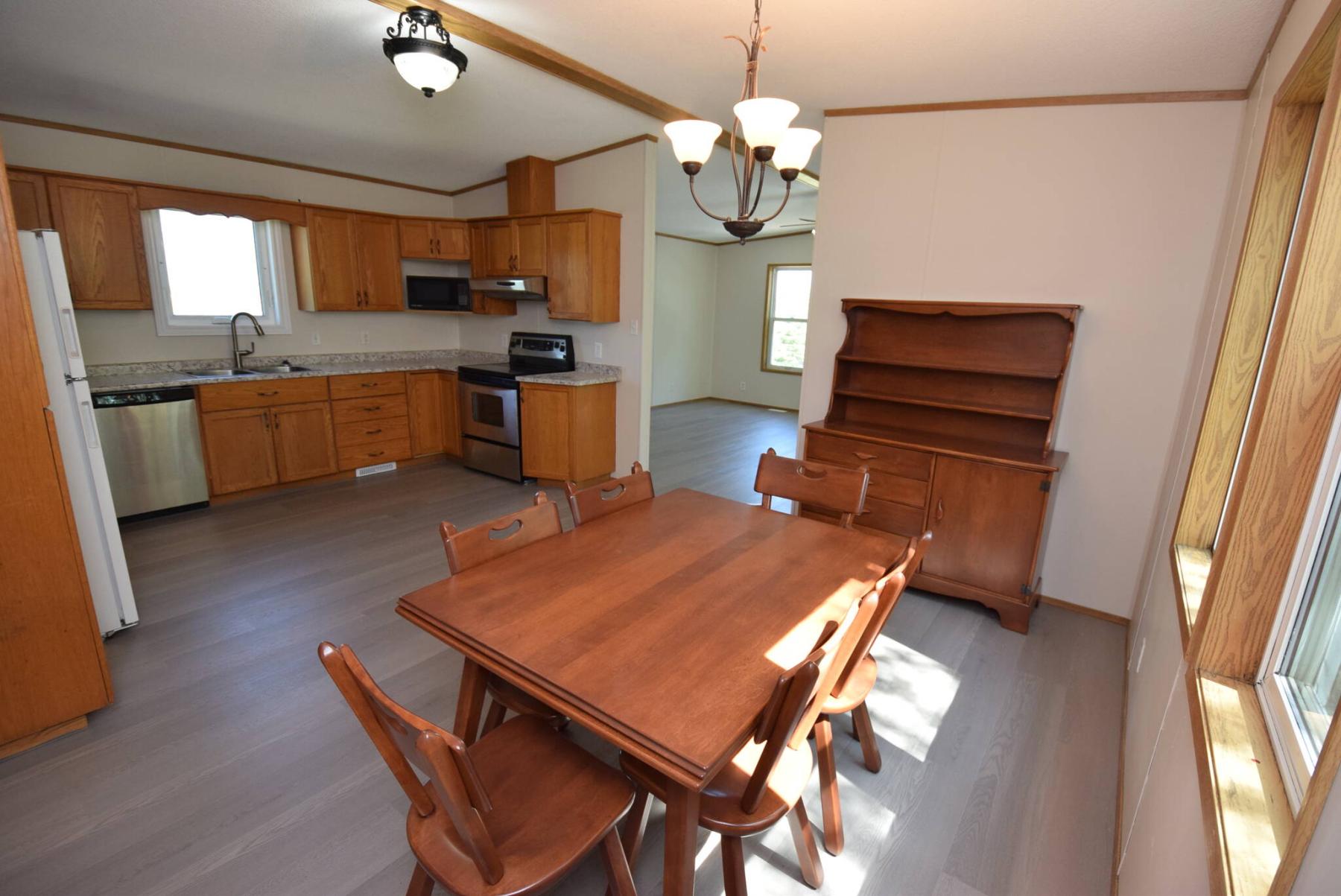 The modular home’s eat-in kitchen is spacious and well-equipped.