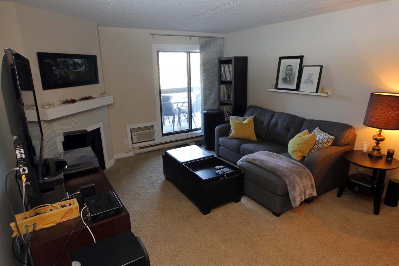 The living room features a corner electric fireplace and sliding patio doors that lead to a large balcony.