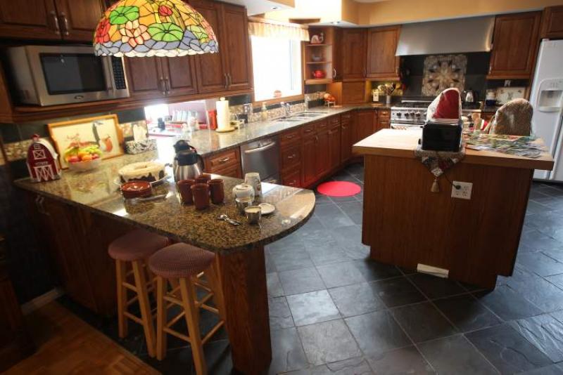 With all the room to move, a two-tiered butcher block island that's perfect for cooking preparation, a wealth of medium-stained oak cabinets and tons of counter space (black/taupe granite) and the peninsula add function as an eating nook or spot to put out freshly baked cakes or cookies... it's a chef's delight.