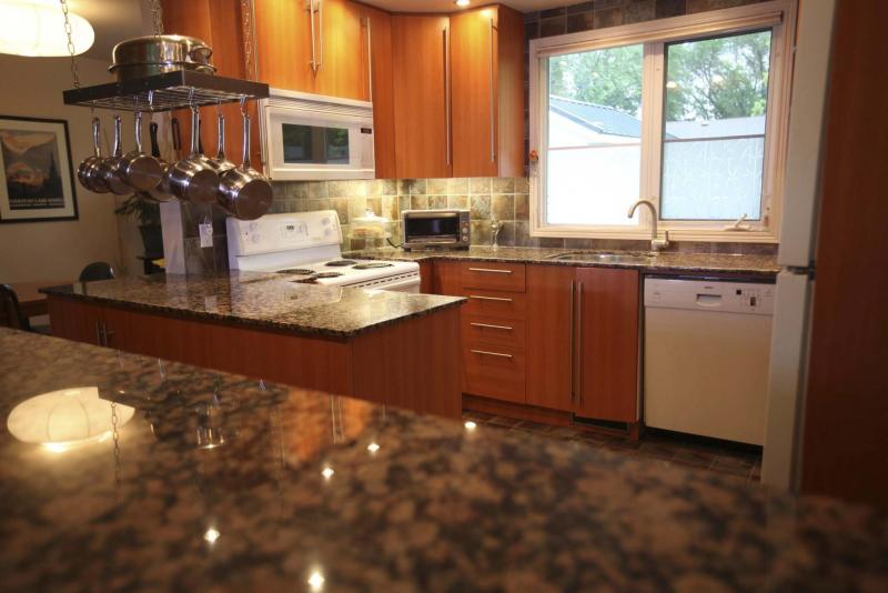 "The kitchen (11 feet by 10.7 feet) is absolutely fabulous — just love the colours and the lighting (a host of pot lights above the sink and interior peninsula)," Dewar said. "There’s tons of storage in the form of (maple veneer) cabinets, as well as cabinets and built-in shelving behind the breakfast bar. The peninsula inside the kitchen adds utility, while the (black/taupe) granite countertops add style. There’s also a (bronze/taupe) tile backsplash, and the tile floor is heated."