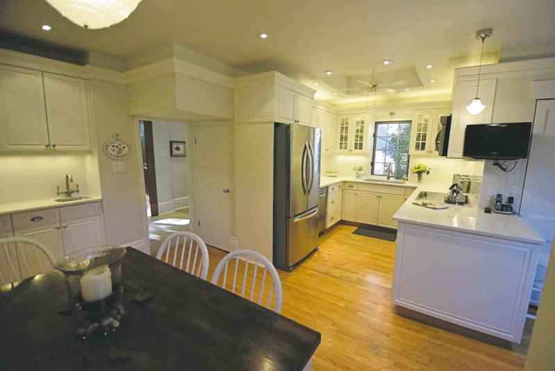 "Very few 100-year-old homes have kitchens like this. With its dinette area -- it holds a table for six -- it's a true eat-in kitchen. From there, you go over the to chef's kitchen, which has been totally redone with white cabinets, (white/grey) quartz countertops, built-in cooktop and stainless steel appliances."