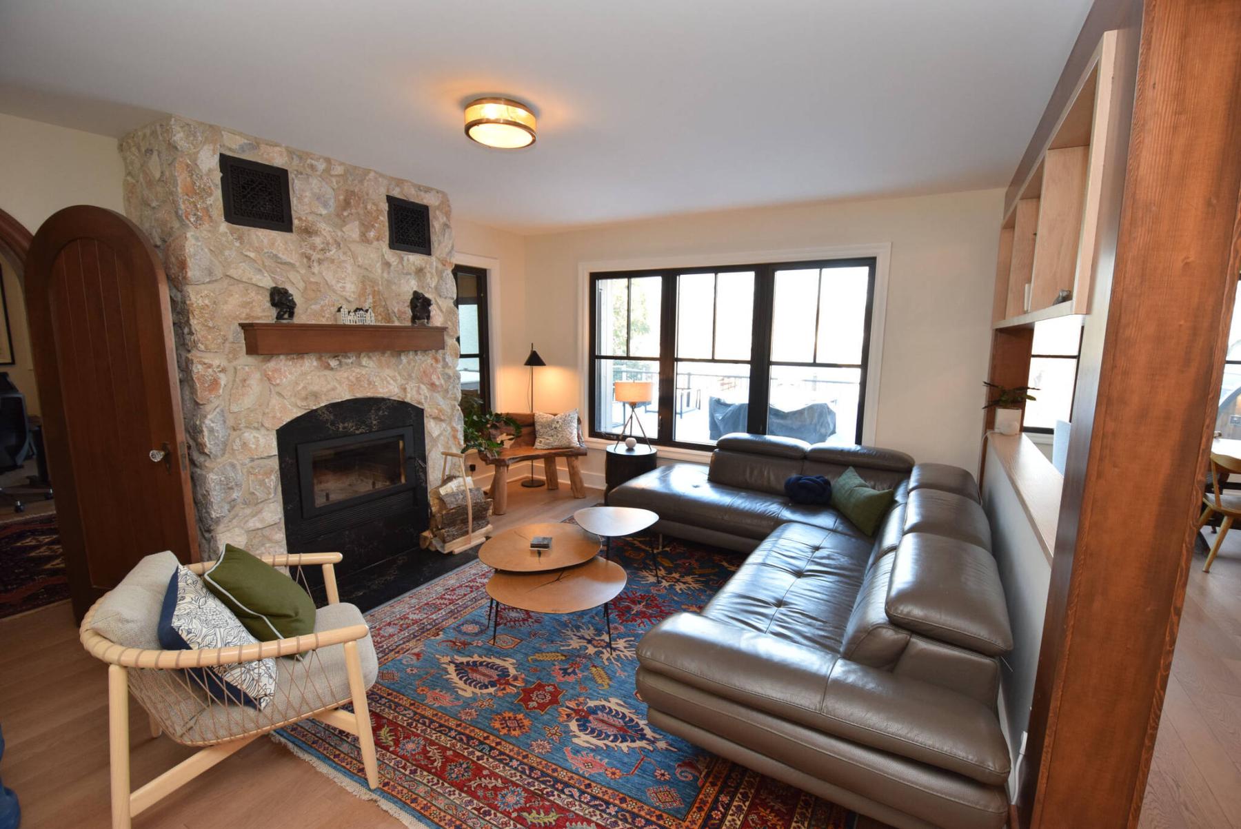 A wood-burning fireplace with stone surround serves as the focal point of the cosy, well-lit living room.
