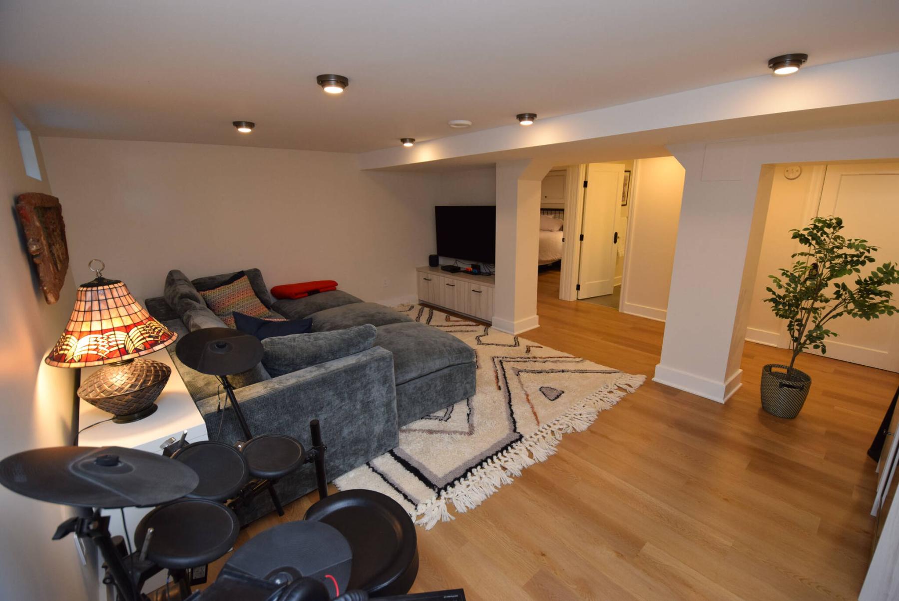 The home’s re-engineered lower level offers a rec room, full-egress bedroom, full bath and ample storage space.