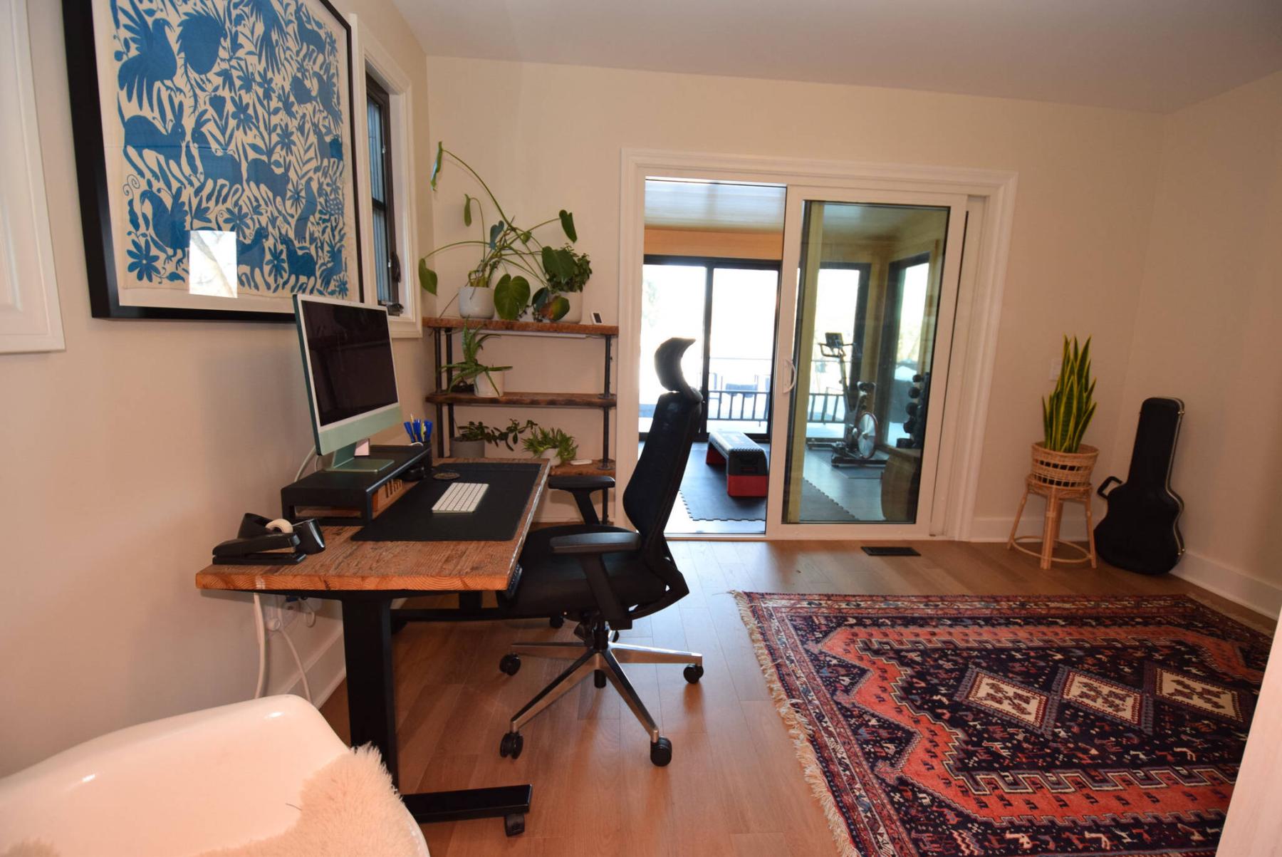 Equipped with a two-piece bath and Murphy bed, the main-floor office is a versatile space connecting to a four-season sunroom leading to a backyard with a hot tub and barrel sauna.