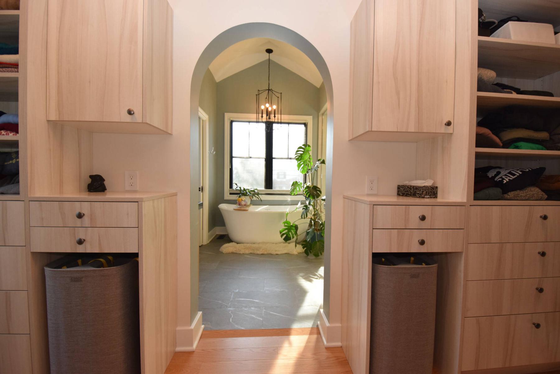 An artistic arched entrance leads into the spa-like ensuite from a large walk-in closet that offers tons of custom storage.