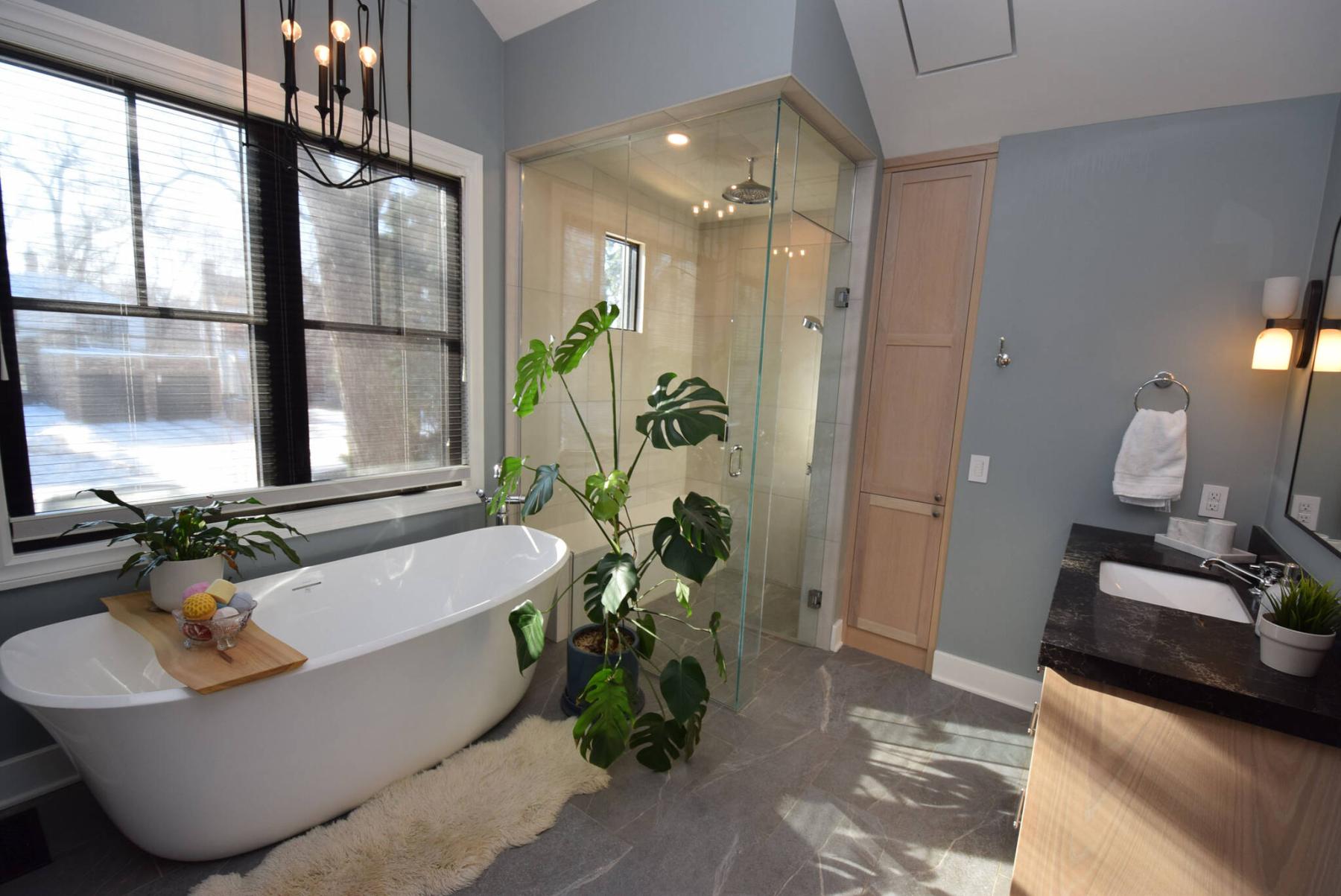 “I think the first thing that strikes you about it are its thoughtful sightlines — there’s so much natural light and the views are amazing all around,” van den Broek says. “And as far as the home’s origins are concerned, the staircase isn’t the only design feature that was carried over from the original home. The main bath is original from the penny-tile floor to the tub with its arched entry.”
