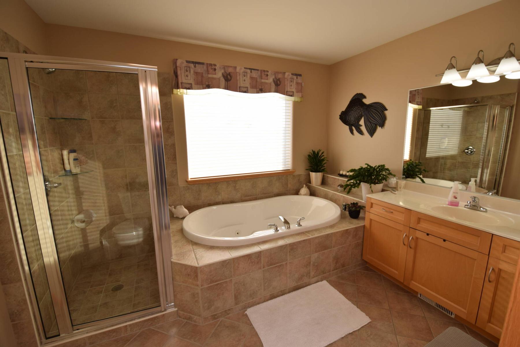“It’s a good size and was placed at the back of the home to give it a quiet, private feel. It offers a large walk-in closet, and ensuite that’s separated from the bedroom by a handy make-up area,” she says. “The ensuite is a lovely space that features a tile floor, walk-in shower and jetted soaker tub set in a tile surround with a large window and tile feature wall behind it.”