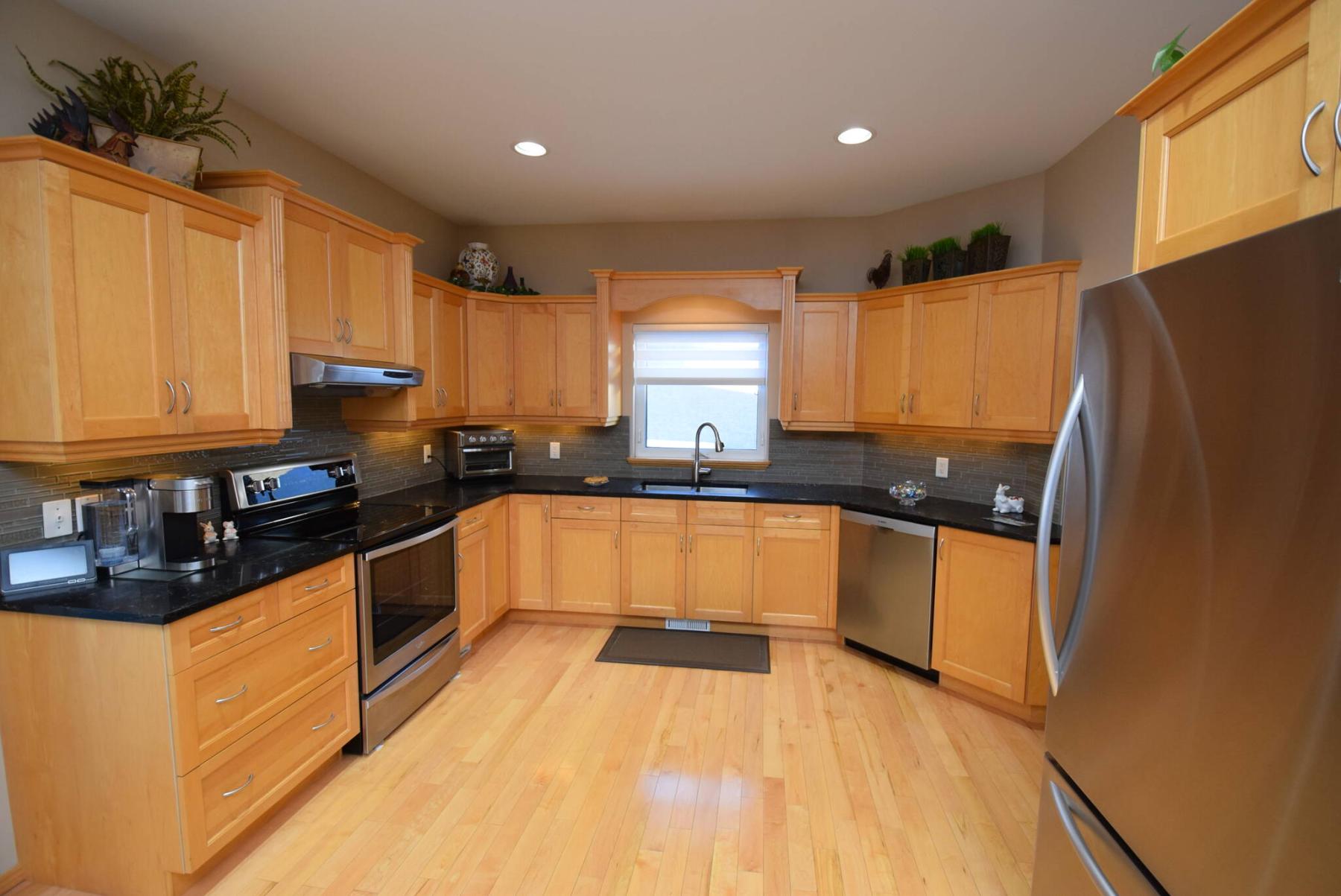 “The kitchen has been beautifully remodeled with quartz countertops, a glass tile backsplash, and stainless appliances. There are tons of natural maple cabinets that surround a double sink that’s set perfectly beneath a large window. A hallway to the right of the kitchen takes you to a powder room and mud/laundry room and a door that connects with the attached double garage.”