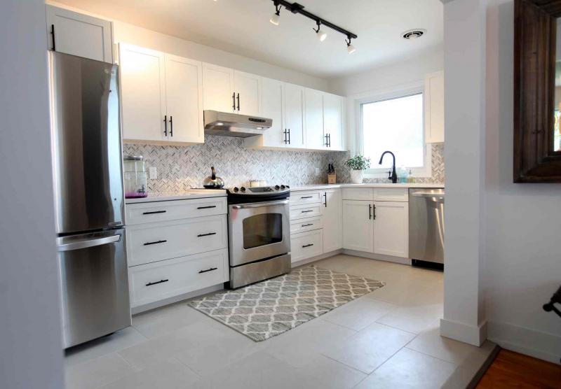 The tastefully-renovated kitchen is also a joy to create gourmet dishes in. “With its grey tile floor, wealth of white cabinets (including pot drawer next to the flat-top stove), white/grey countertops, grey zig-zag tile backsplash and stainless steel appliances, it’s a beautiful, functional space. The view from the large window over the double sink is nice, too.”