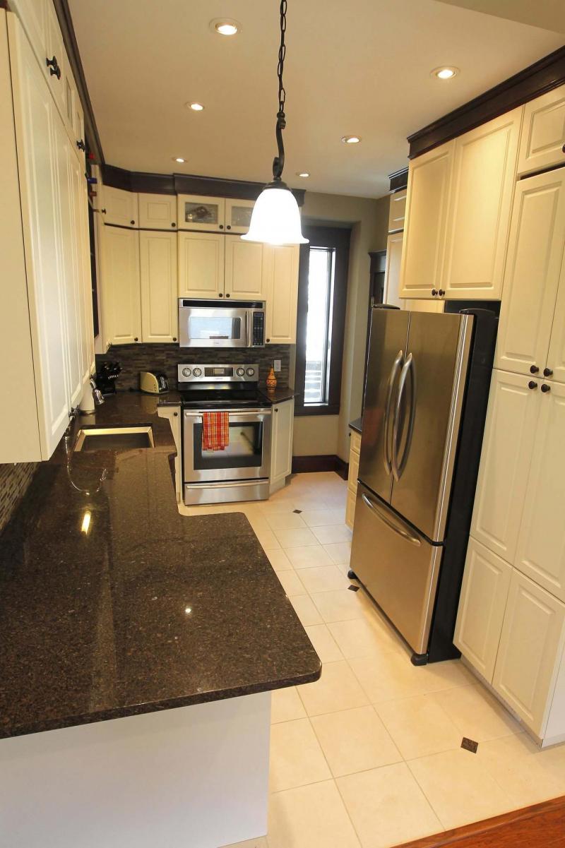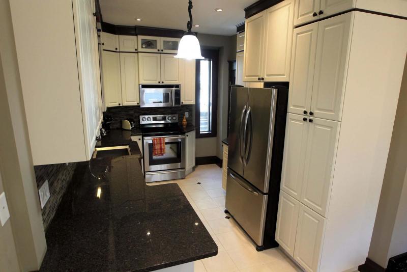 A prime example is the kitchen/dining area. When the outgoing owners bought the home eight years ago, a wall divided the dining room from the kitchen. Subsequent renovations ensured that no longer would be the case. "The renovation opened the kitchen beautifully on to the dining room. The kitchen was then remodelled with granite countertops, glass-tile backsplash, modern white cabinets and a heated tile floor," Bouvier said.