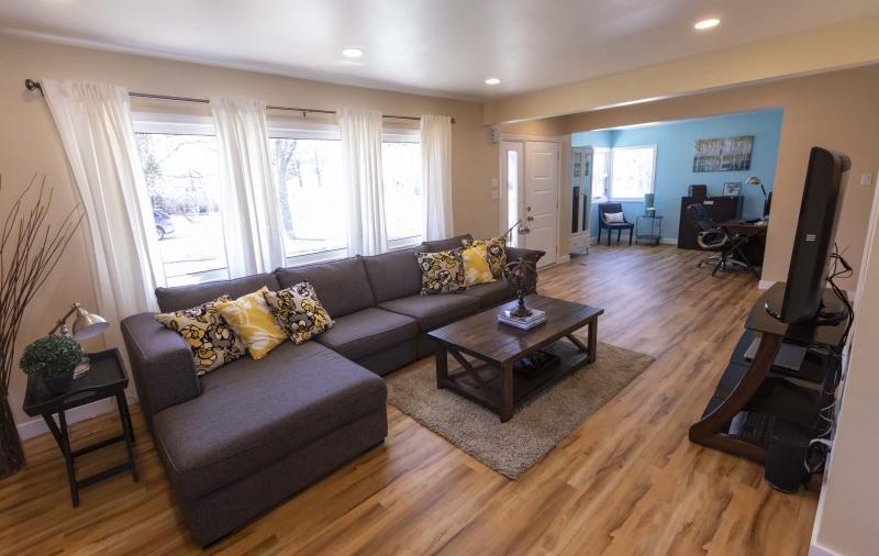 "There used to be walls to the left and right of the front door. The wall to the left was removed, and an addition was put on to create an office space that opened up on to the living room," he says. "Removing the wall to the right of the front door really opened things up and gave the area a contemporary, open-concept, great room feel."