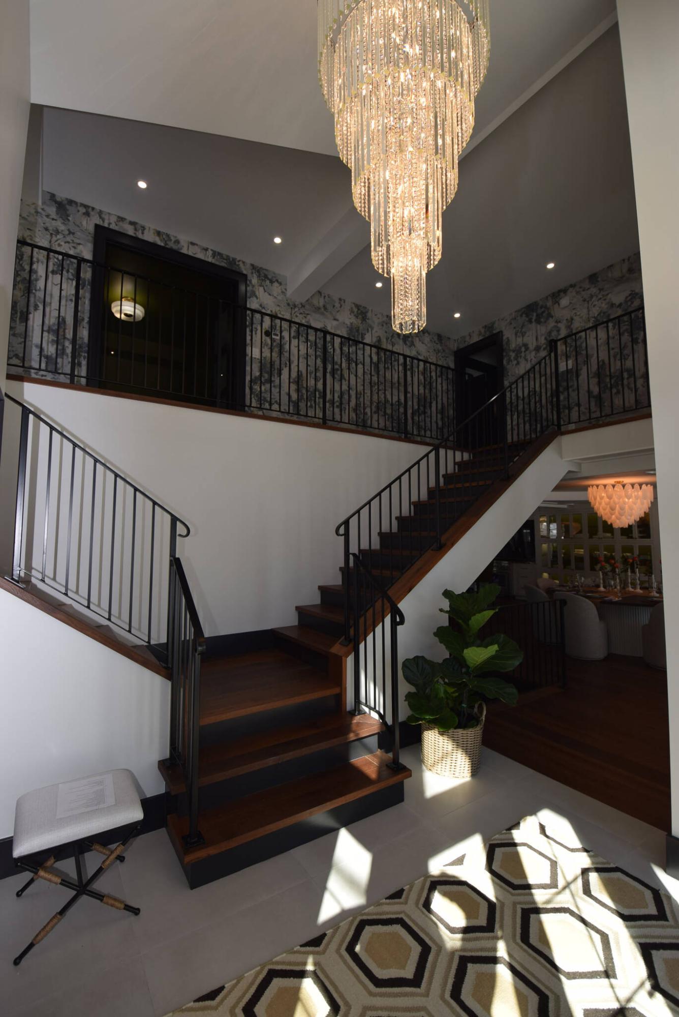 “It takes you a minute or two to take everything in — the high ceiling, gorgeous crystal chandelier and the stunning staircase that splits off in two directions,” says Fazekas. “And the wallpaper behind the stairs is beautiful.”