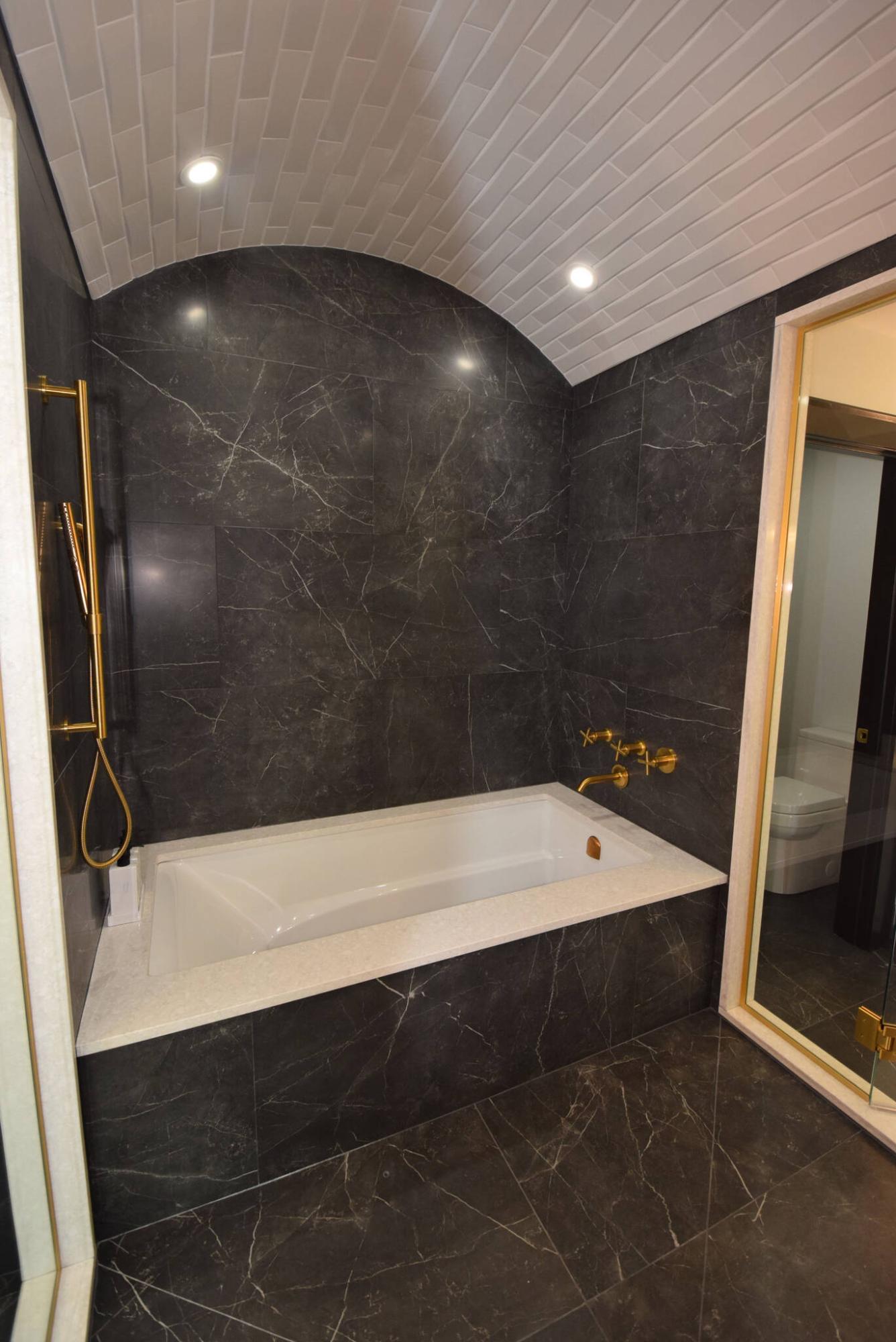 A deep soaker tub surrounded by charcoal-toned tile and a grey barrel ceiling overhead is just part of the primary bedroom’s ensuite, which also features with a stunning shower area.