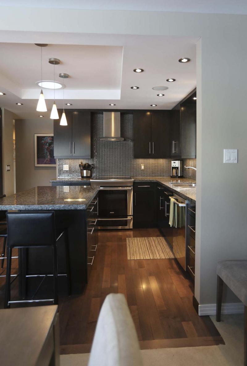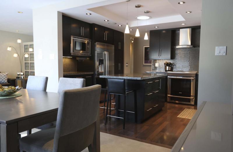 "It’s a chef’s delight with a five-by-four-foot island that seats three, brown quartz countertops, mocha (glass) tile backsplash, espresso maple cabinets, espresso maple hardwoods and high-end stainless Electrolux appliances. There’s also a pantry, and a huge window over the sink that lets in even more light. It also has speakers to play your favourite music on while entertaining."