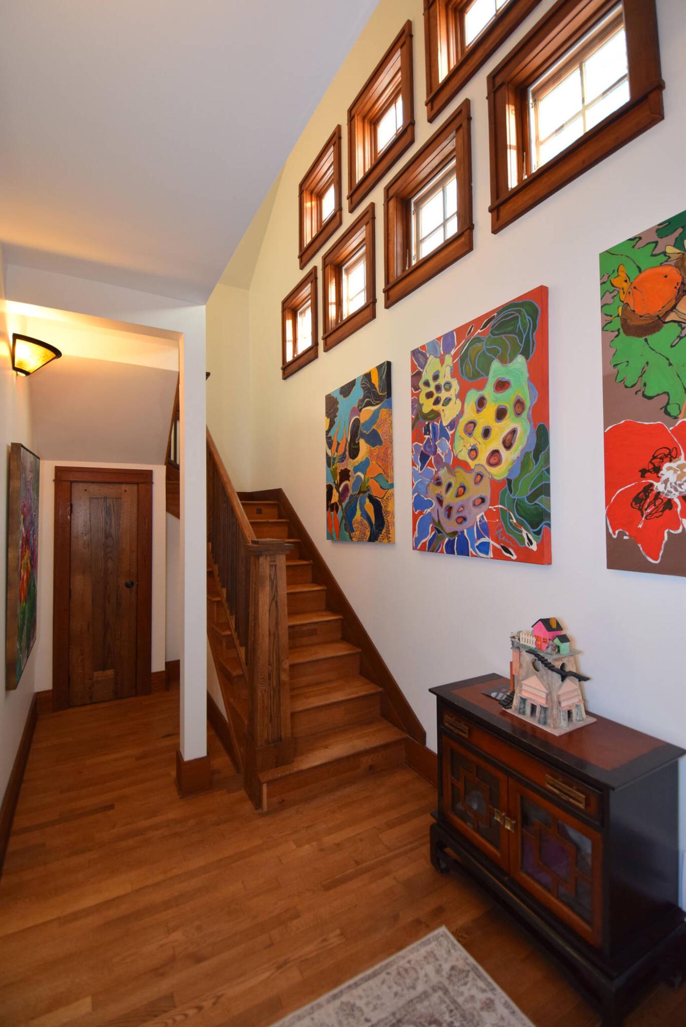 “Take all the amazing stained glass piano windows on the wall beside the staircase — their trim came from oak beams that were taken from the old Eaton’s building downtown. The trim looks incredible. Then there’s the artwork on the wall by the stairs, which is the work of the owner, who’s an accomplished artist.”