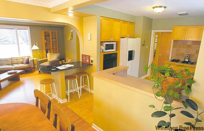 "It was turned into a peninsula-style kitchen with new countertops, natural maple cabinets, tile backsplash and gorgeous cork floor. The peninsula neatly divides the kitchen from the dining room, which is a nice size. Theres plenty of space in all three areas (kitchen, dining room and family room), and tons of light flows in from the windows on the three walls."