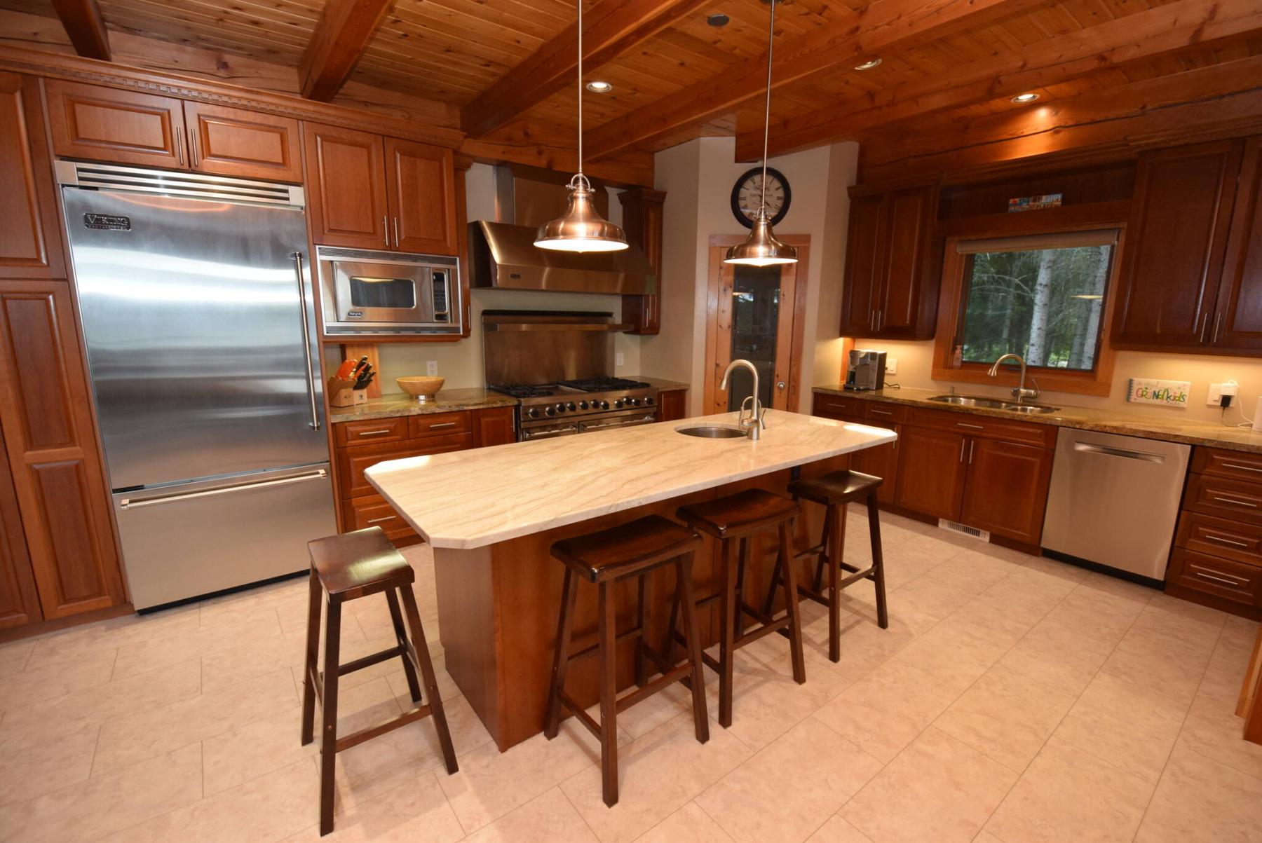 The kitchen features cherrywood cabinets, a huge quartz island with vegetable sink and high-end Viking stainless appliances.